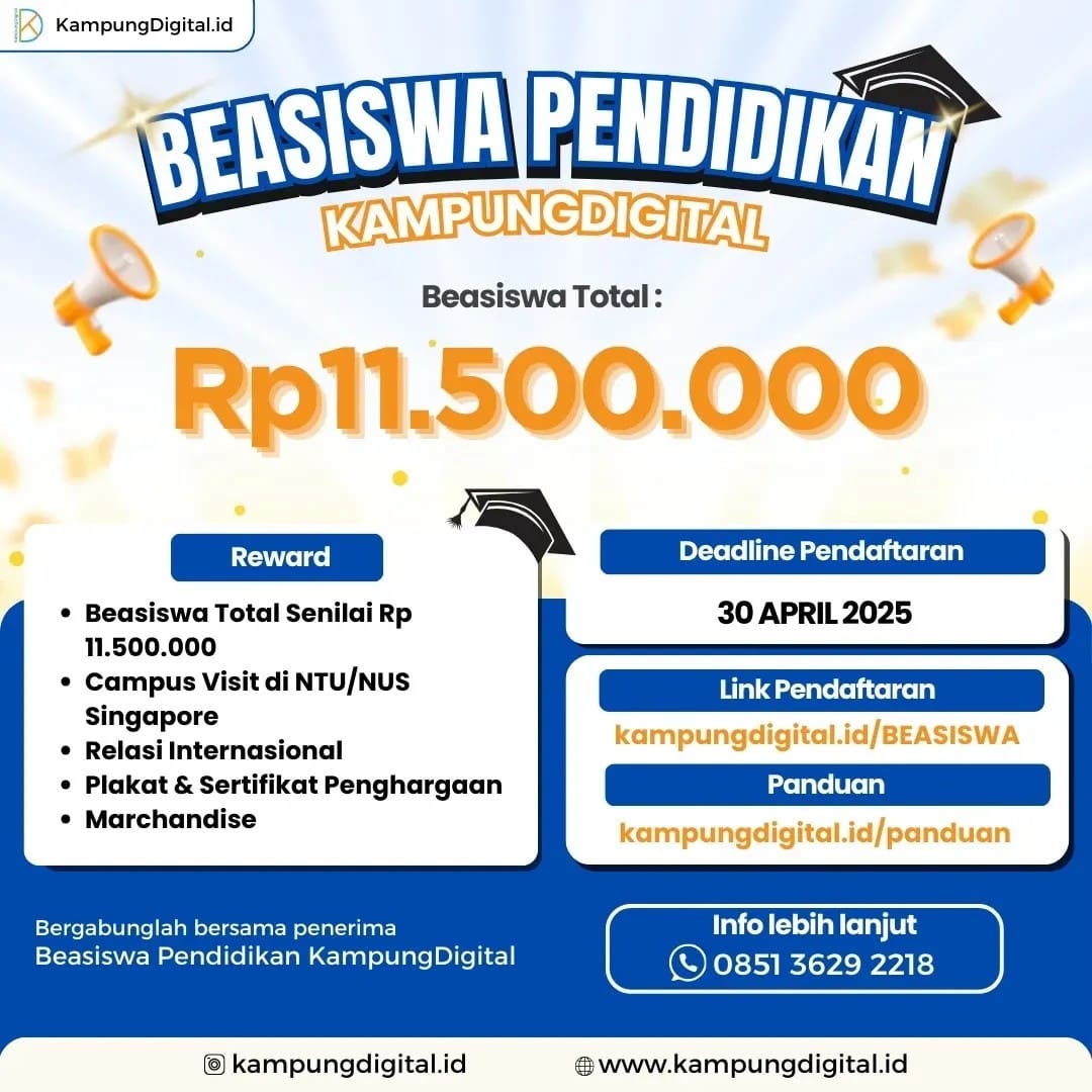 #BeasiswaPendidikan #Beasiswa #Scholarship #KampungDigital #Berprestasi #Mahasiswa #Siswa #Diploma #D1 #D2ย #D3ย #D4ย #S1ย #S2