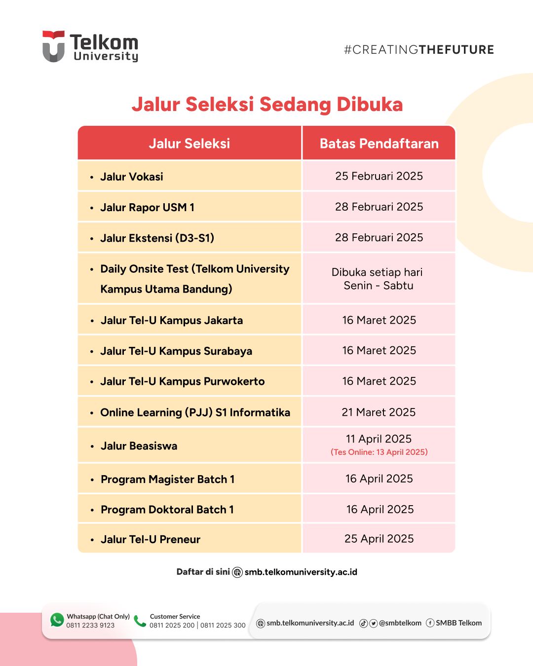 Berikut adalah list Jalur Seleksi @telkomuniversity yang sedang dibuka saat ini 📌