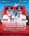 Dengan penuh rasa bangga mengucapkan selamat dan sukses atas pelantikan Dra. Hj. Khofifah Indar Parawansa, M.Si. dan Dr. Emil Elestianto Dardak, M.Sc. sebagai Gubernur dan Wakil Gubernur Jawa Timur periode 2025-2030.