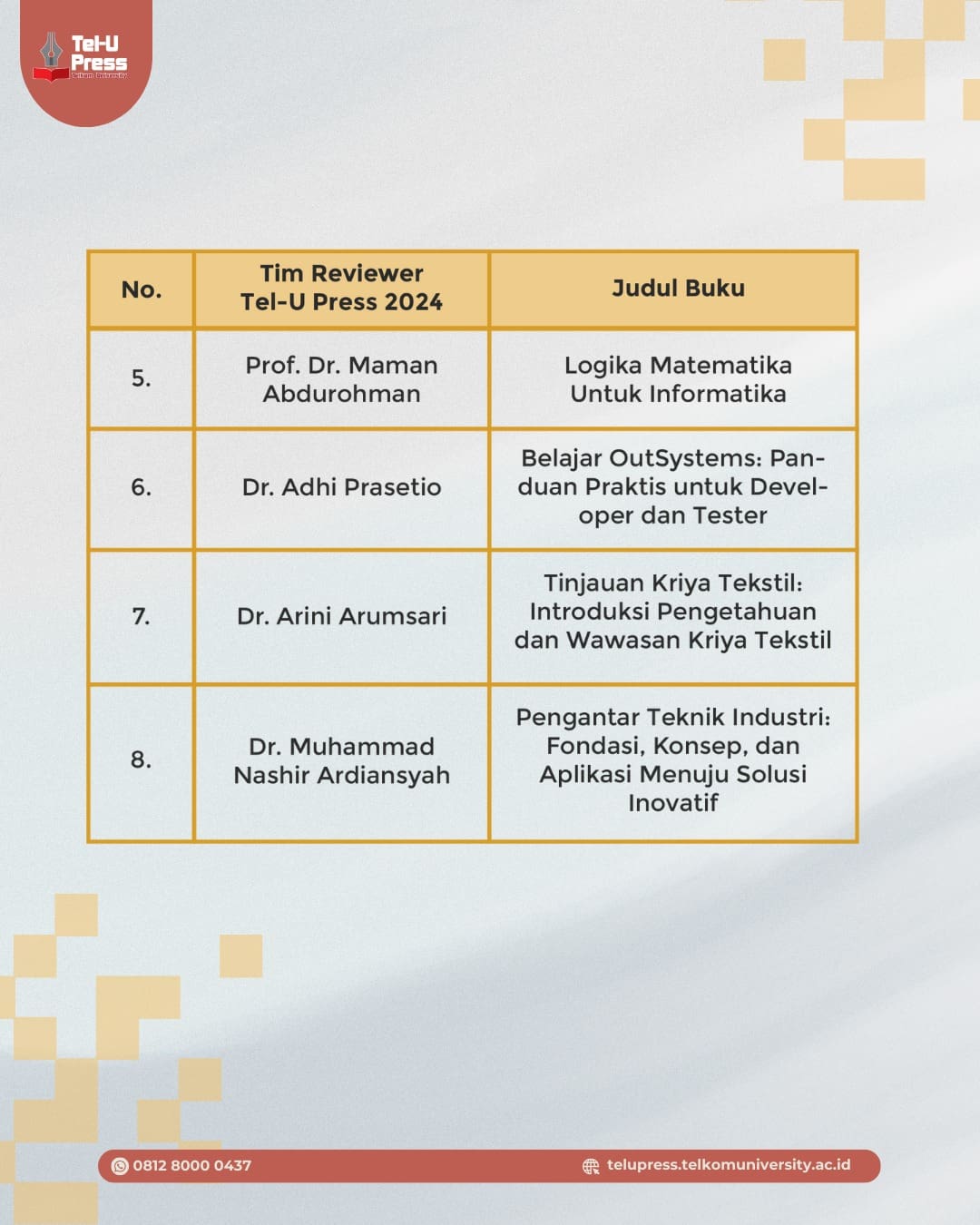 Kami mengucapkan apresiasi setinggi-tingginya kepada Tim Reviewer Tel-U Press 2024 atas dedikasi dan kontribusinya dalam memastikan setiap karya yang diterbitkan memiliki kualitas terbaik. 🙌📚