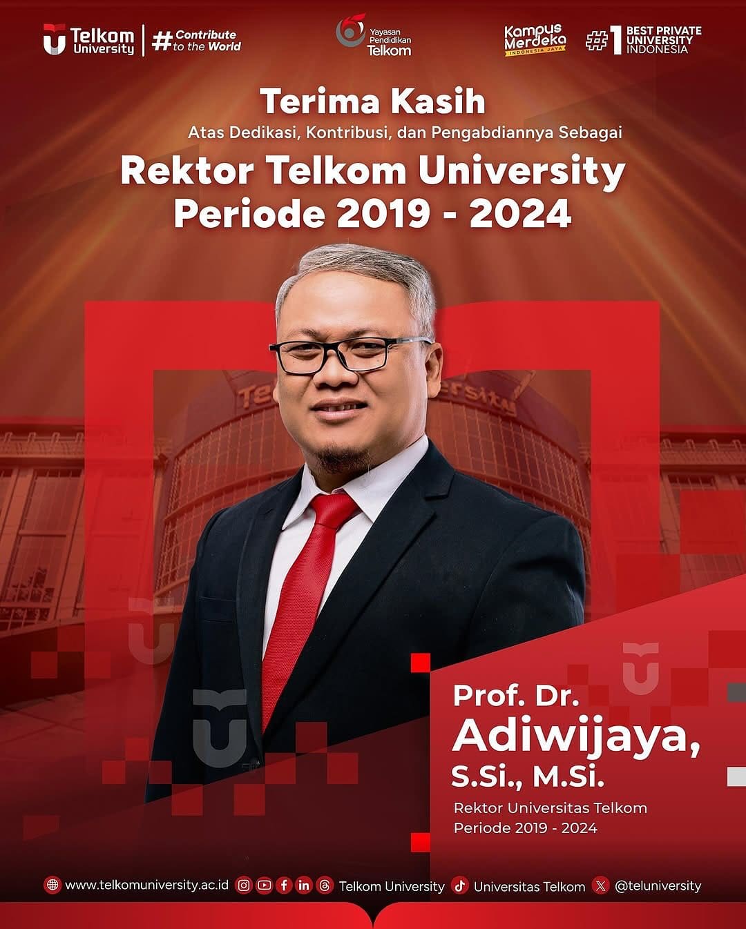 Civitas Academica Universitas Telkom turut mengucapkan terimakasih yang sebesar-besarnya kepada Rektor Universitas Telkom Periode 2019 – 2024 atas dedikasi, kontribusi, dan pengabdiannya di Universitas Telkom