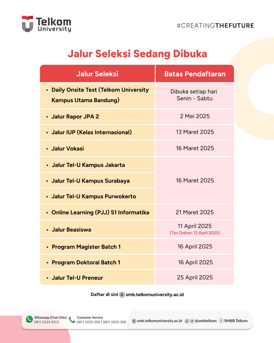 Berikut adalah list Jalur Seleksi @telkomuniversity yang sedang dibuka pada bulan Maret 📌
