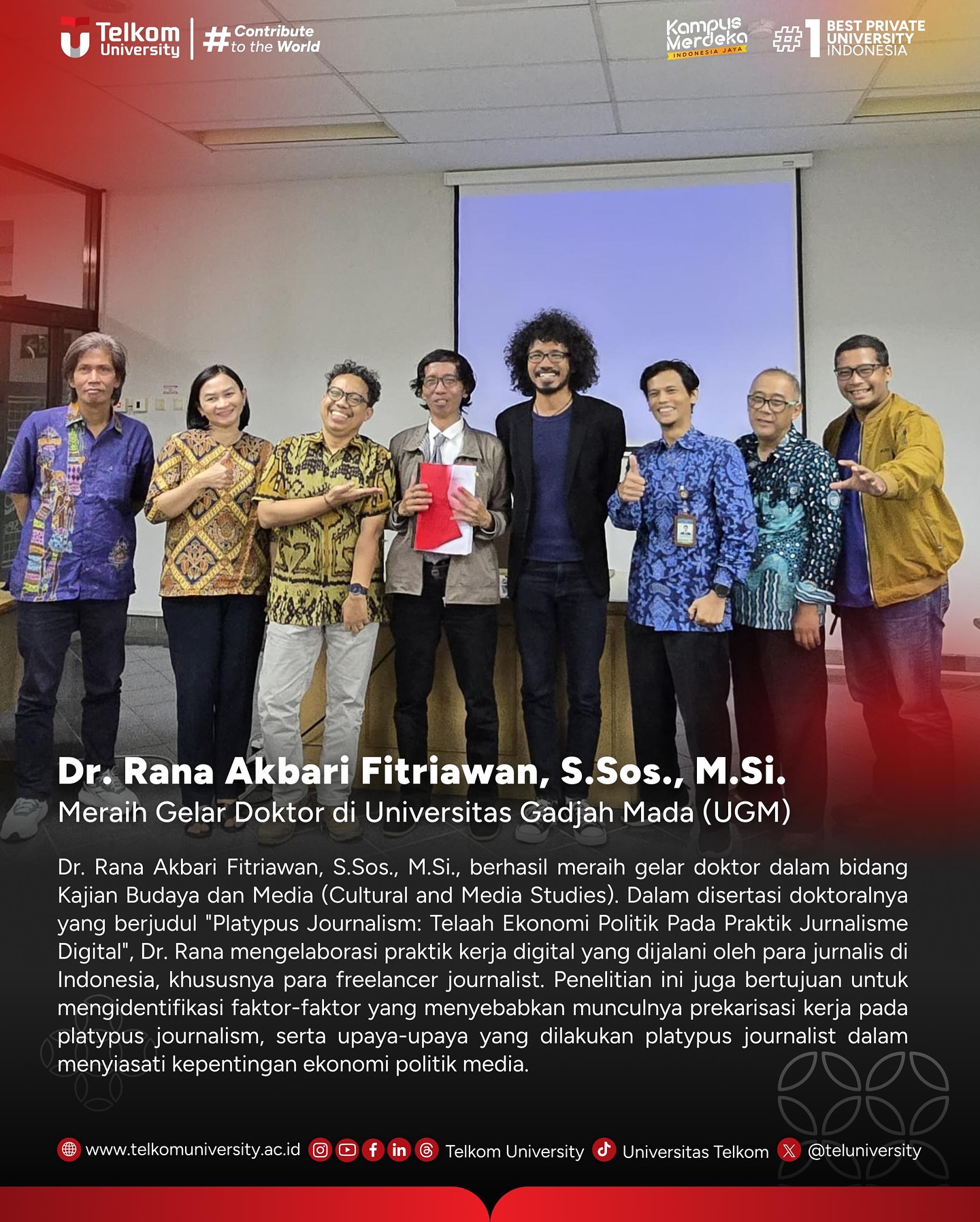 Dosen Fakultas Komunikasi dan Ilmu Sosial, Dr. Rana Akbari Fitriawan, S.Sos., M.Si. berhasil meraih gelar doktor dalam bidang Kajian Budaya dan Media (Cultural and Media Studies) di Universitas Gadjah Mada (UGM). Dalam disertasi doktoralnya yang berjudul “Platypus Journalism: Telaah Ekonomi Politik Pada Praktik Jurnalisme Digital.”