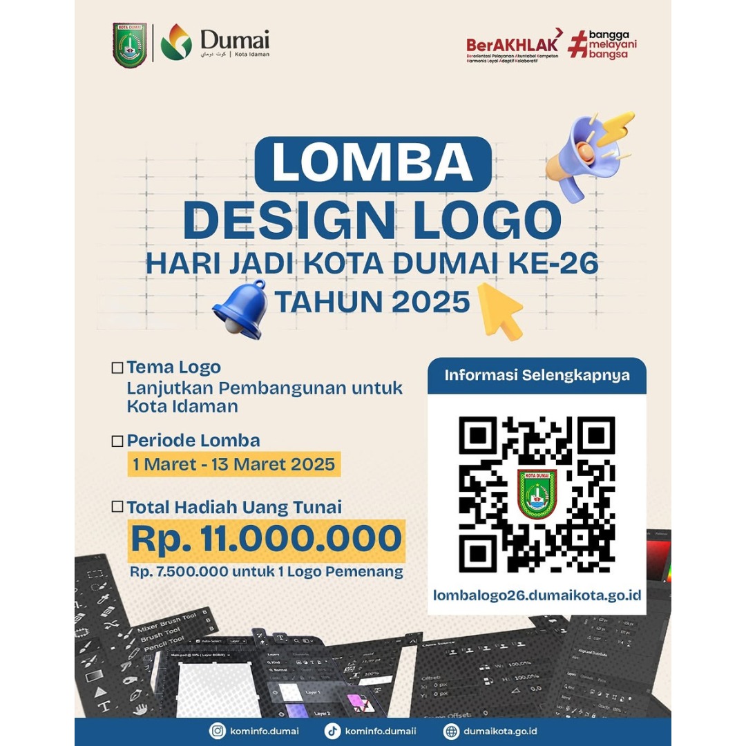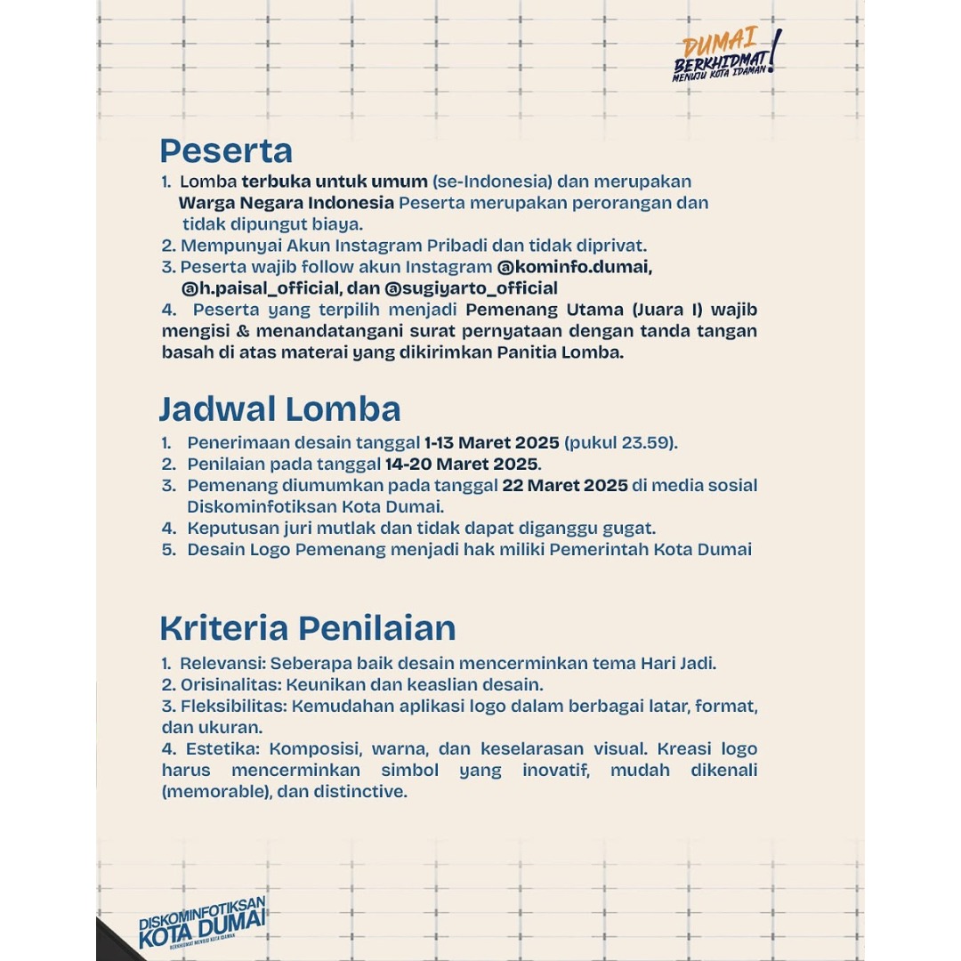 Halo Sobatkom, kabar gembira untuk semua designer grafis se Indonesia! Diskominfotiksan Kota Dumai kembali menggelar Lomba Desain Logo Hari Jadi Kota Dumai ke-26 tahun 2025 dengan periode lomba 1-13 Maret 2025.