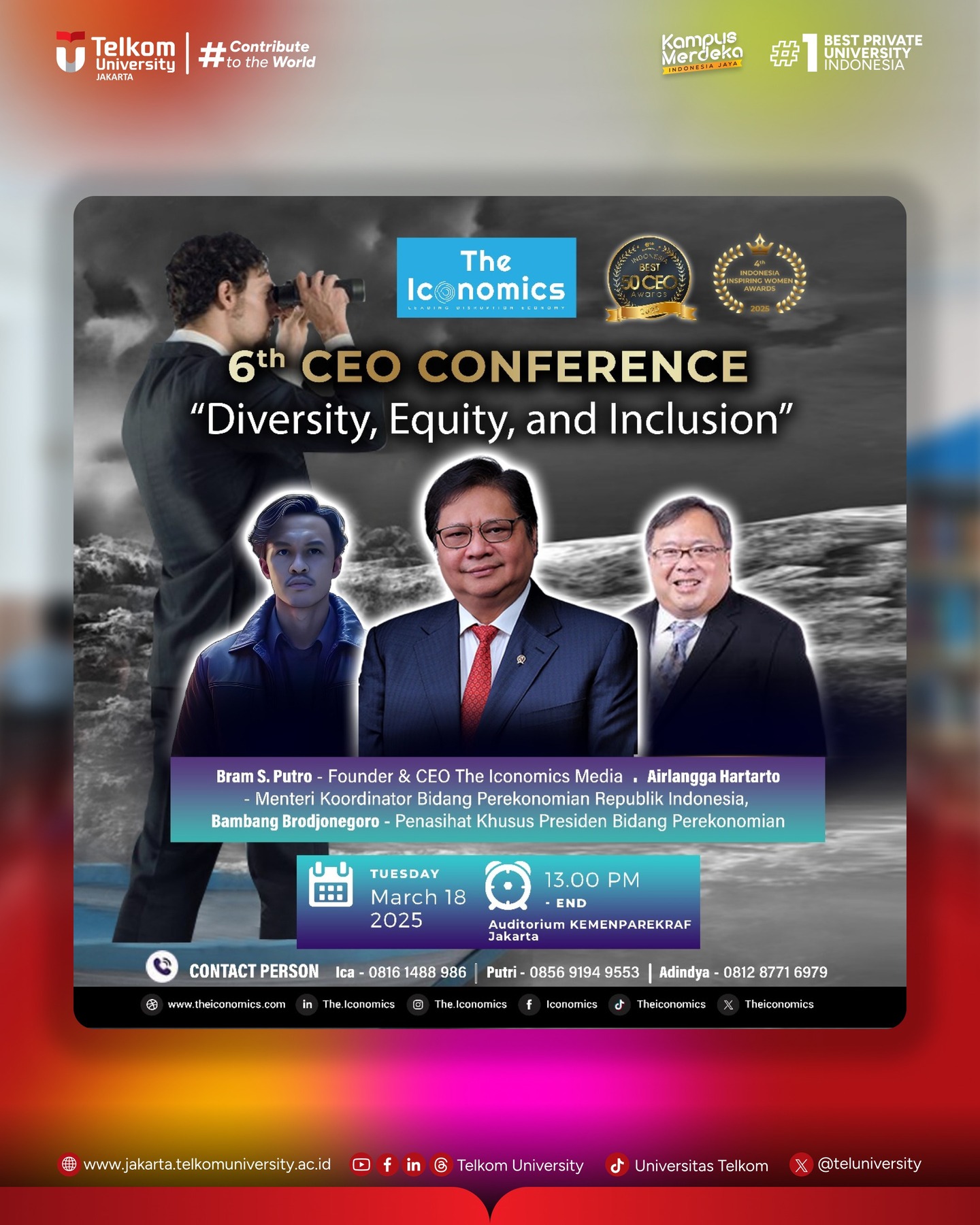 The Iconomics akan menggelar CEO Conference & Indonesia Best 50 CEO Awards 2025 dengan tema Diversity, Equity, and Inclusion. Rangkaian acara ini dibuka oleh CEO Conference & Indonesia Best 50 CEO Awards 2025 yang telah berlangsung 6 tahun dan dilanjutkan dengan The Iconomics awards Indonesia Best 50 CEO Awards 2025 “Employees’ Choice” (6th Anniversary), acara ini akan dilaksanakan pada: