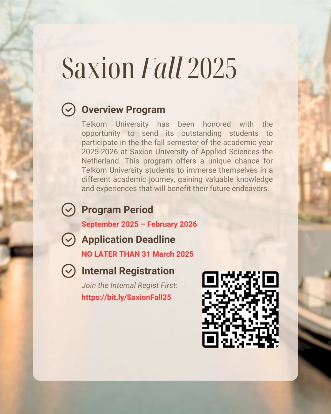 Telkom University students, don’t miss this incredible opportunity! Study for a semester at Saxion University of Applied Sciences, Netherlands, and experience a new academic and cultural journey.