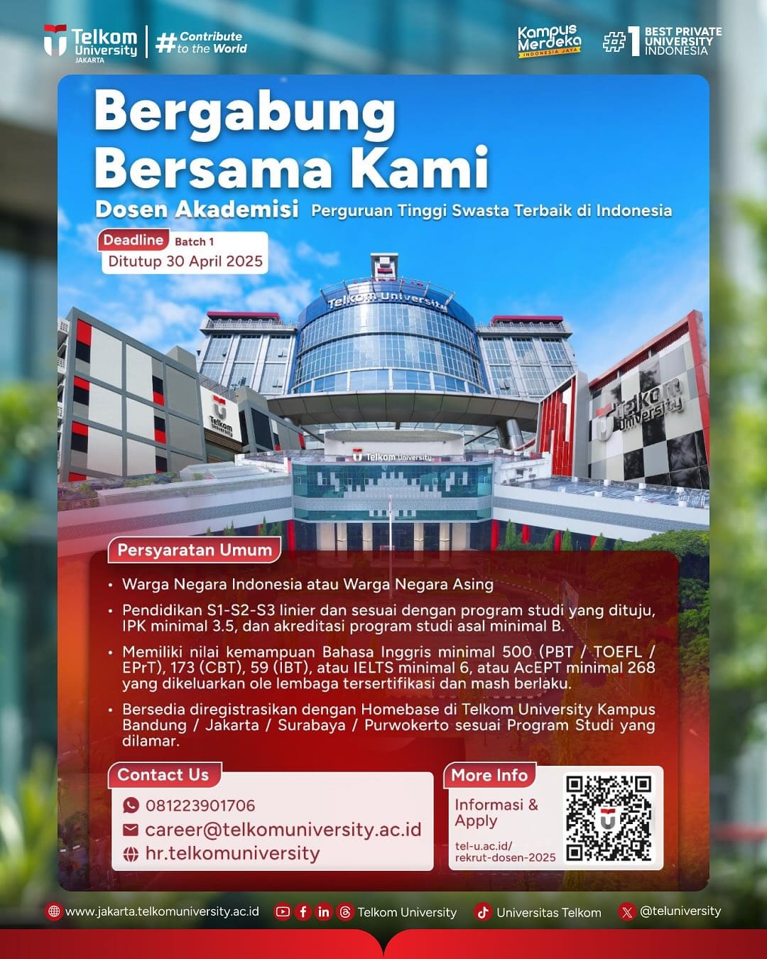 Pendaftaran & informasi selengkapnya: tel-u.ac.id/rekrut-dosen-2025