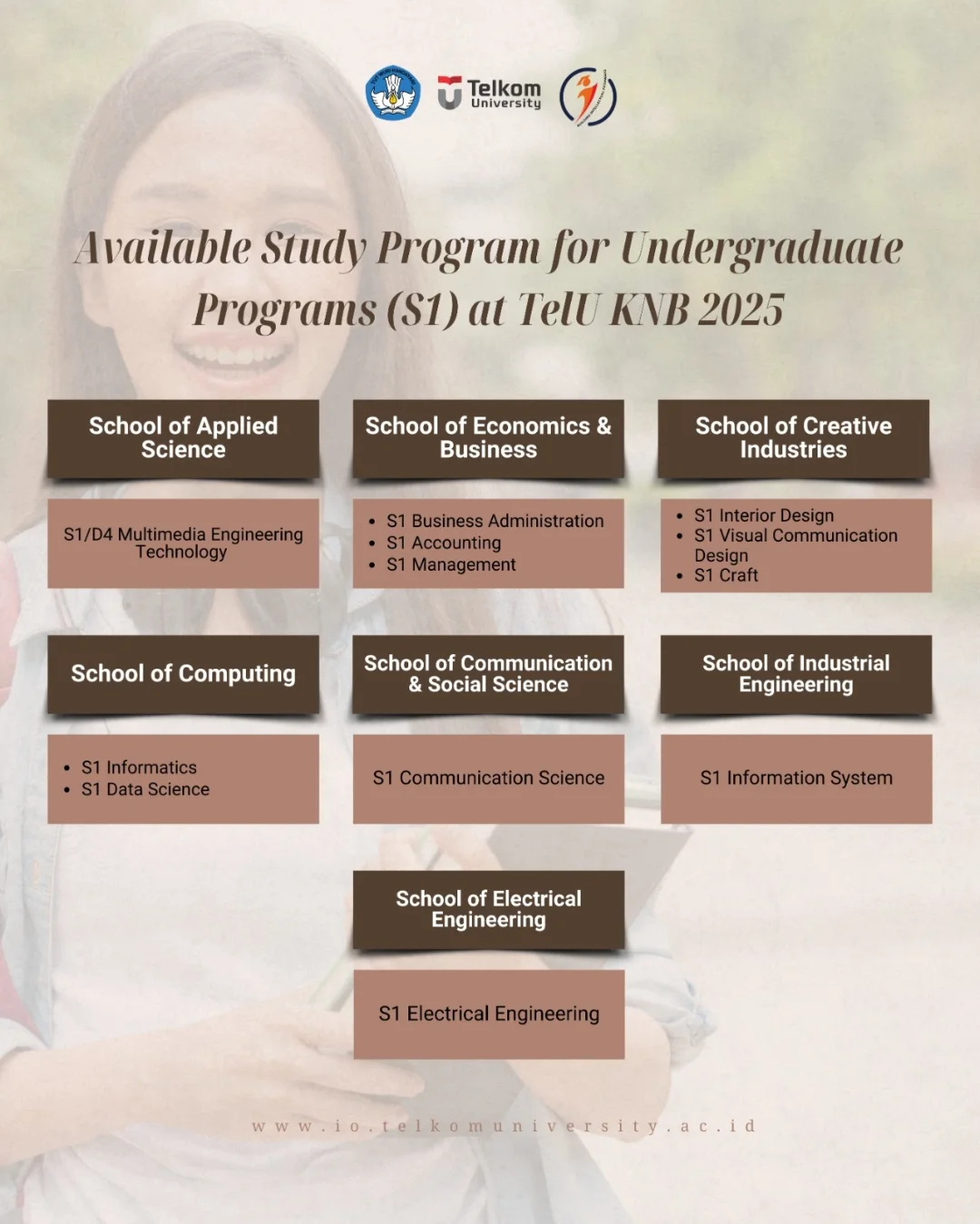 Before deciding to apply for the KNB 2025 scholarship, it’s better to familiarize yourself with the majors offered by Telkom University. There are several top-notch majors avalaible for undergraduate degree program (S1) from this Best Private Campus in Indonesia; please check the details in the image above.