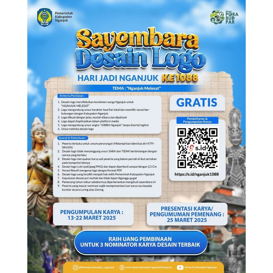 Ayo ambil bagian dalam mewujudkan “Nganjuk Melesat” dengan ikutan Sayembara Desain Logo Hari Jadi Nganjuk ke-1088 tahun 2025.