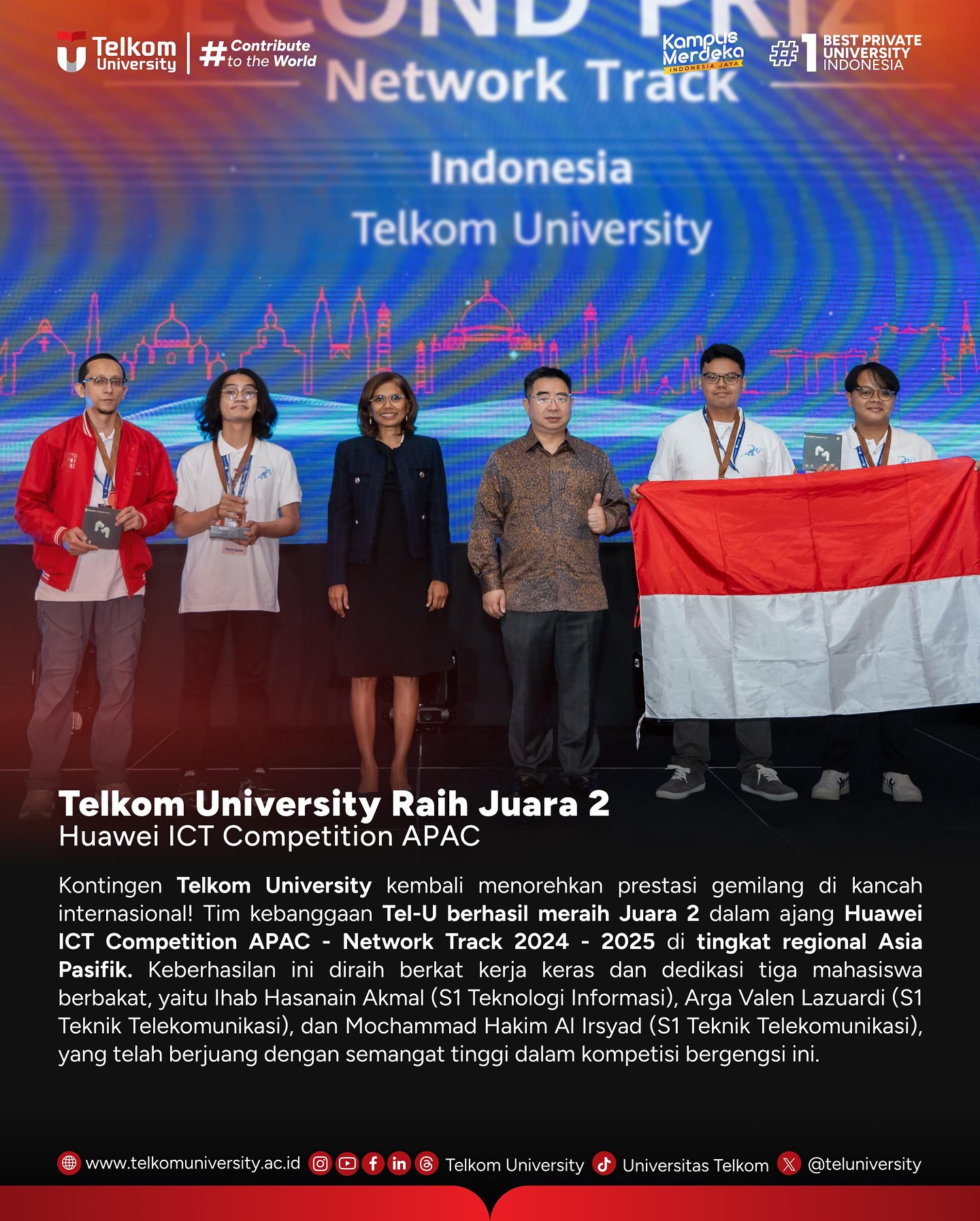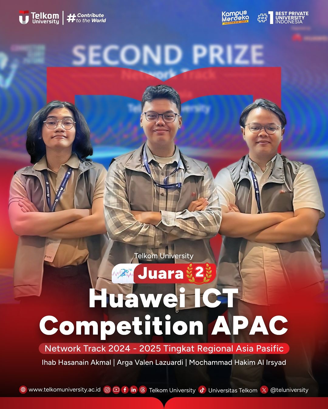 Tim kebanggaan Tel-U berhasil meraih Juara 2 dalam ajang Huawei ICT Competition APAC – Network Track 2024 – 2025 di tingkat regional Asia Pasifik. Keberhasilan ini diraih berkat kerja keras dan dedikasi tiga mahasiswa berbakat, yaitu lhab Hasanain Akmal (S1 Teknologi Informasi), Arga Valen Lazuardi (S1 Teknik Telekomunikasi), dan Mochammad Hakim Al Irsyad (S1 Teknik Telekomunikasi), yang telah berjuang dengan semangat tinggi dalam kompetisi bergengsi ini