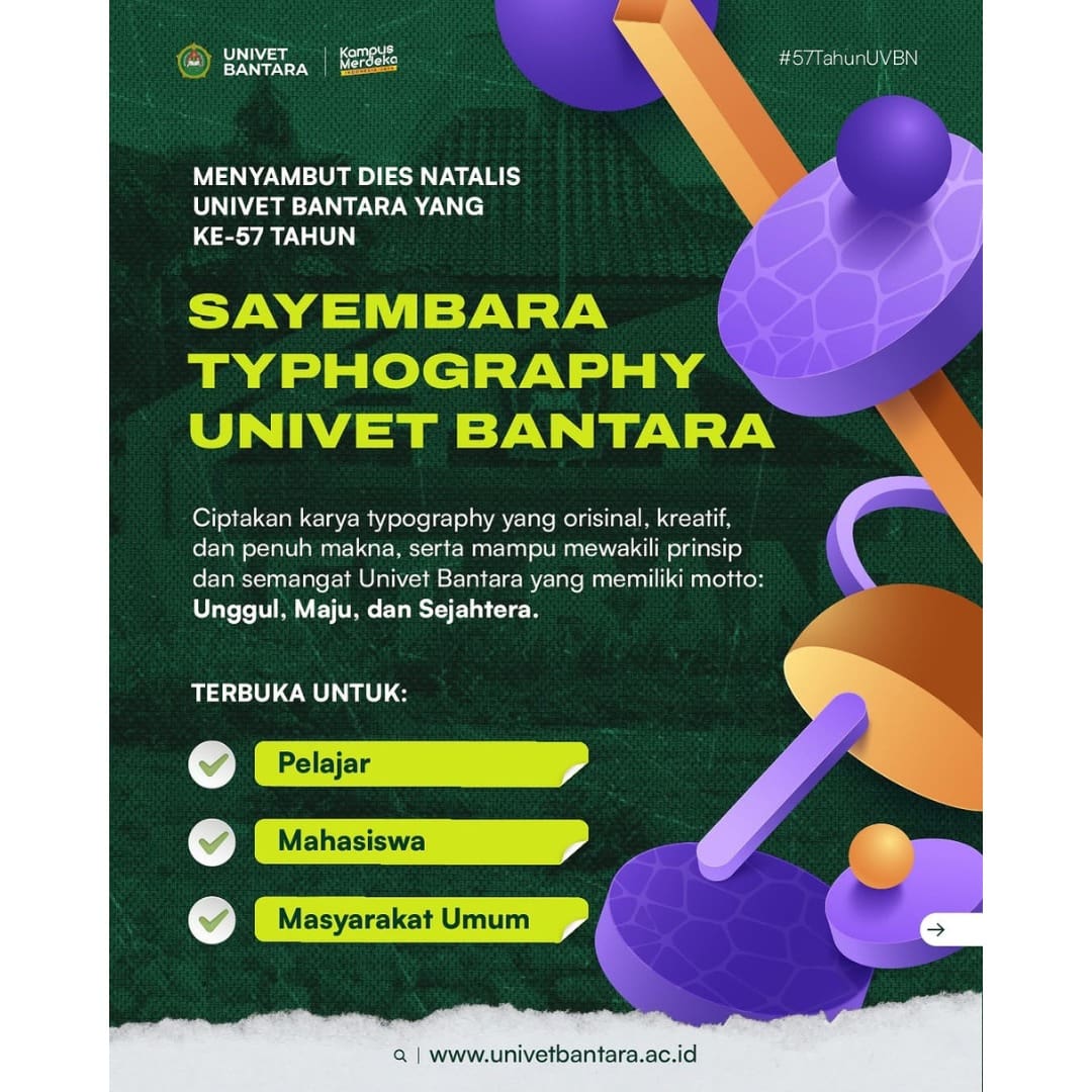 Buat kamu yang jago main huruf, saatnya unjuk kreativitas! ππ₯ Dalam rangka Dies Natalis ke-57, Universitas Veteran Bangun Nusantara ngadain Sayembara Typography buat pelajar, mahasiswa, dan masyarakat umum!