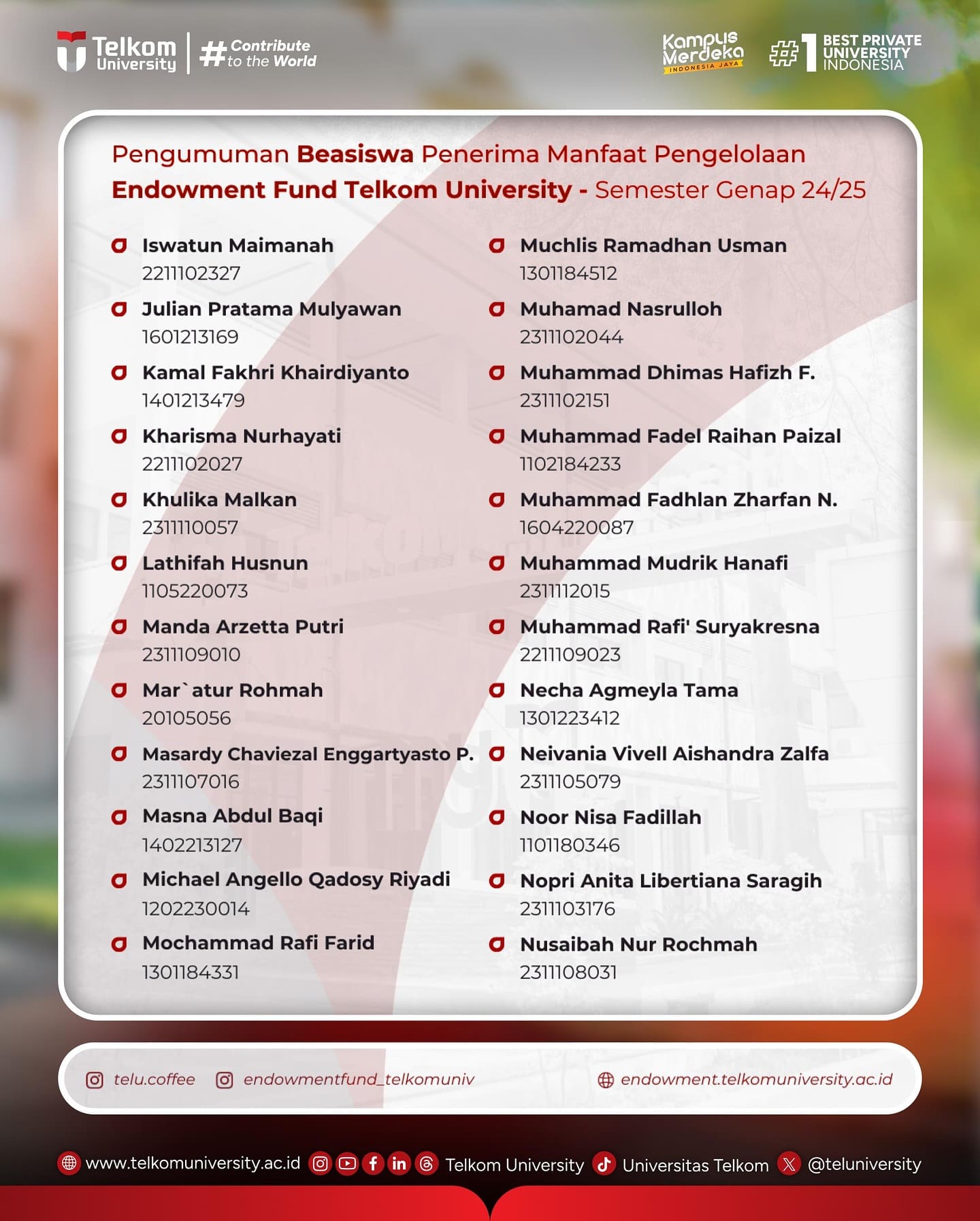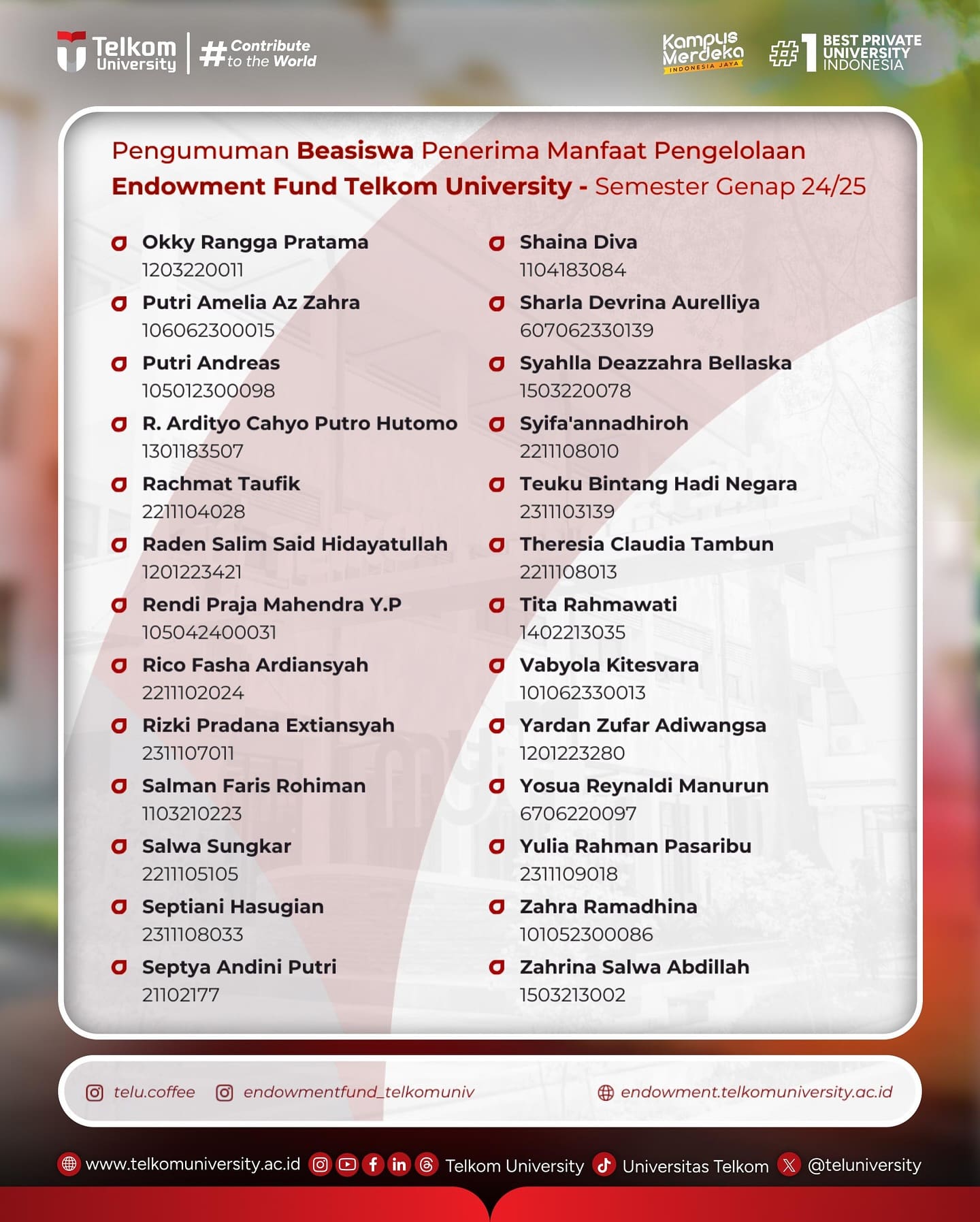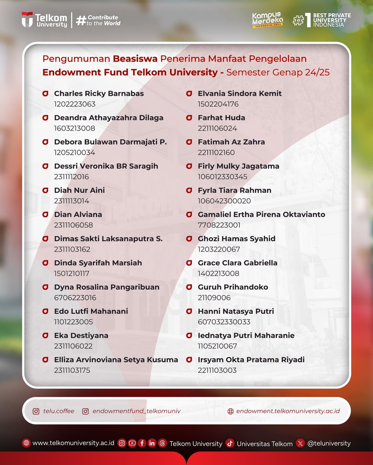 Selamat kepada para penerima Beasiswa Manfaat Hasil Pengembangan Endowment Fund Tel-U Semester Genap 2024/2025 (pengumuman berdasarkan urutan abjad), semoga menjadi motivasi untuk tetap semangat mengemban Pendidikan dalam mencapai prestasi akademik dan non akademik, serta mewujudkan cita-cita untuk berkarya bagi bangsa dan dunia di masa yang akan datang.