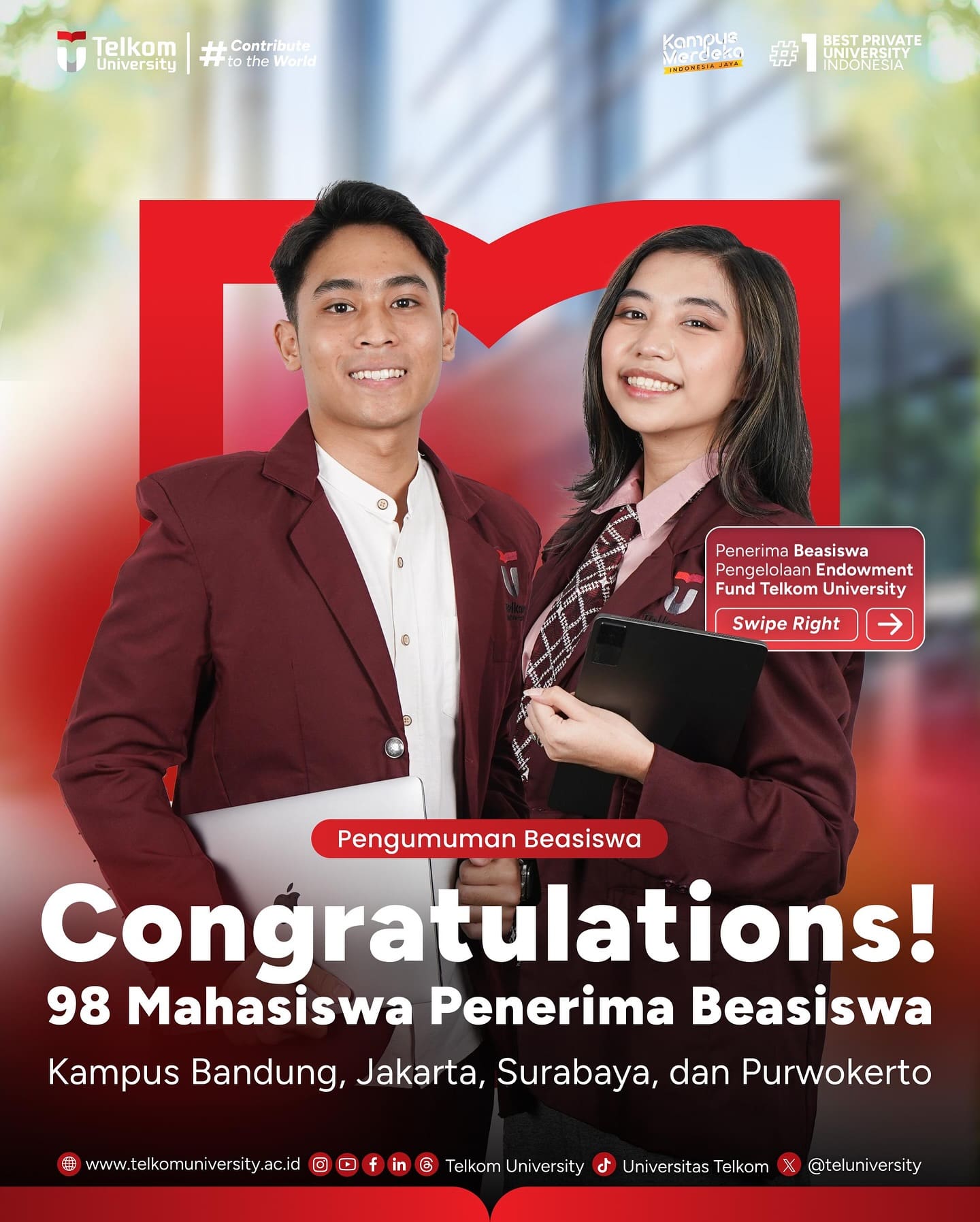 #TelkomUniversity #KampusSwastaTerbaik #CreatingTheFuture #ContributeToTheWorld #EntrepreneurialUniversity #SustainabilityUniversity