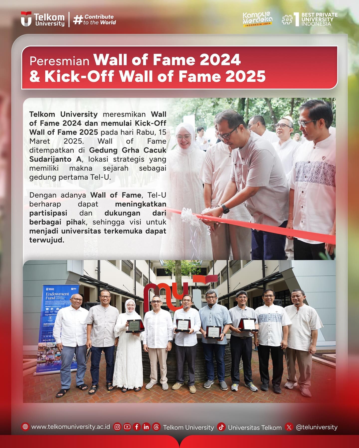 Telkom University melalui Direktorat Pengembangan Karir, Alumni, dan Endownment (CAE) telah meluncurkan program Wall of Fame yang bertempat di Gedung Grha Cacuk Sudarijanto A, lokasi strategis yang memiliki makna sejarah sebagai gedung pertama Tel-U.