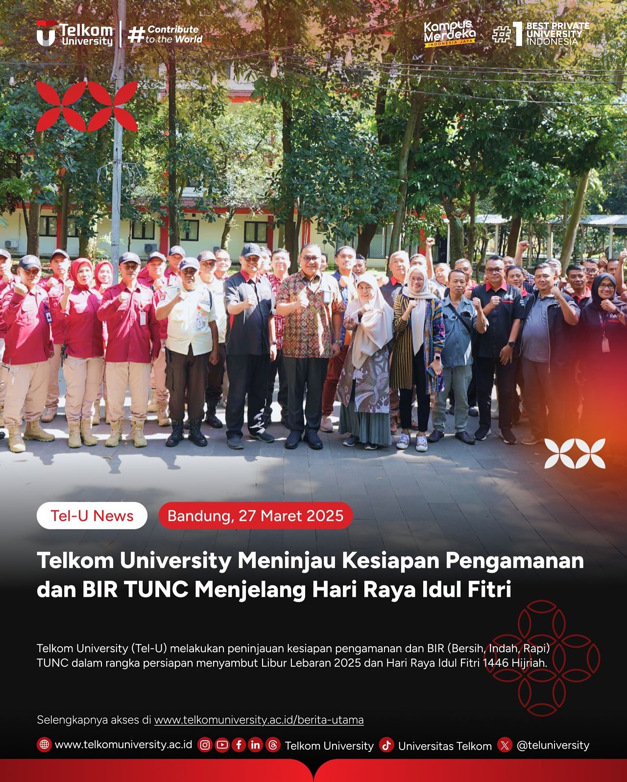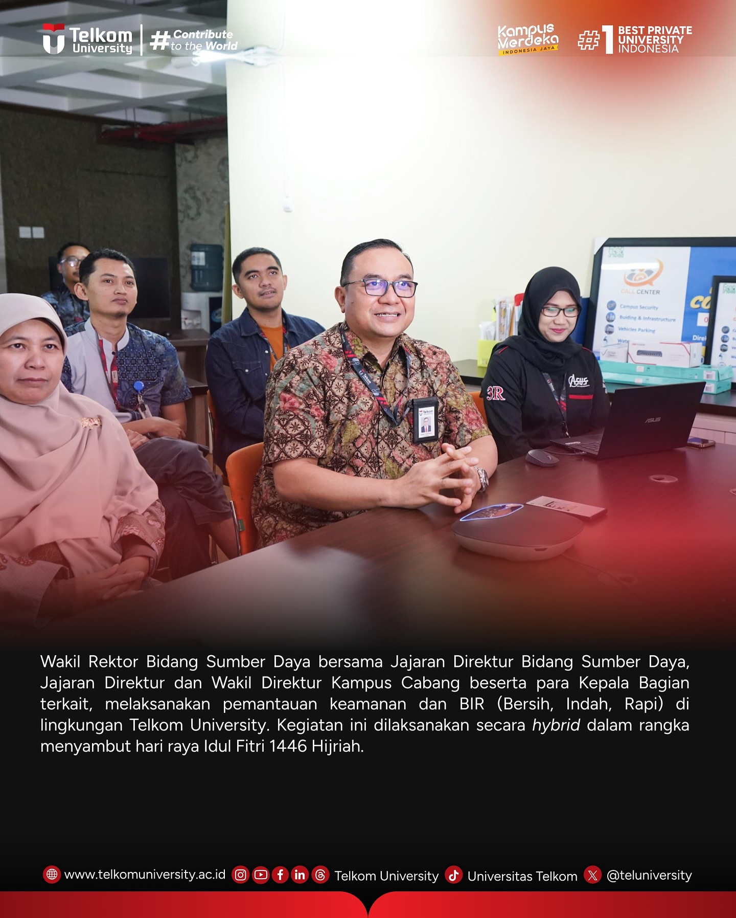 Wakil Rektor Bidang Sumber Daya bersama Jajaran Direktur Bidang Sumber Daya, Jajaran Direktur dan Wakil Direktur Kampus Cabang, beserta para Kepala Bagian Terkait, melaksanakan pemantauan keamanan dan BIR (Bersih, Indah, Rapi) di lingkungan Telkom University. Kegiatan ini dilaksanakan secara hybrid, dalam rangka menyambut hari libur Idul Fitri 1446 H.