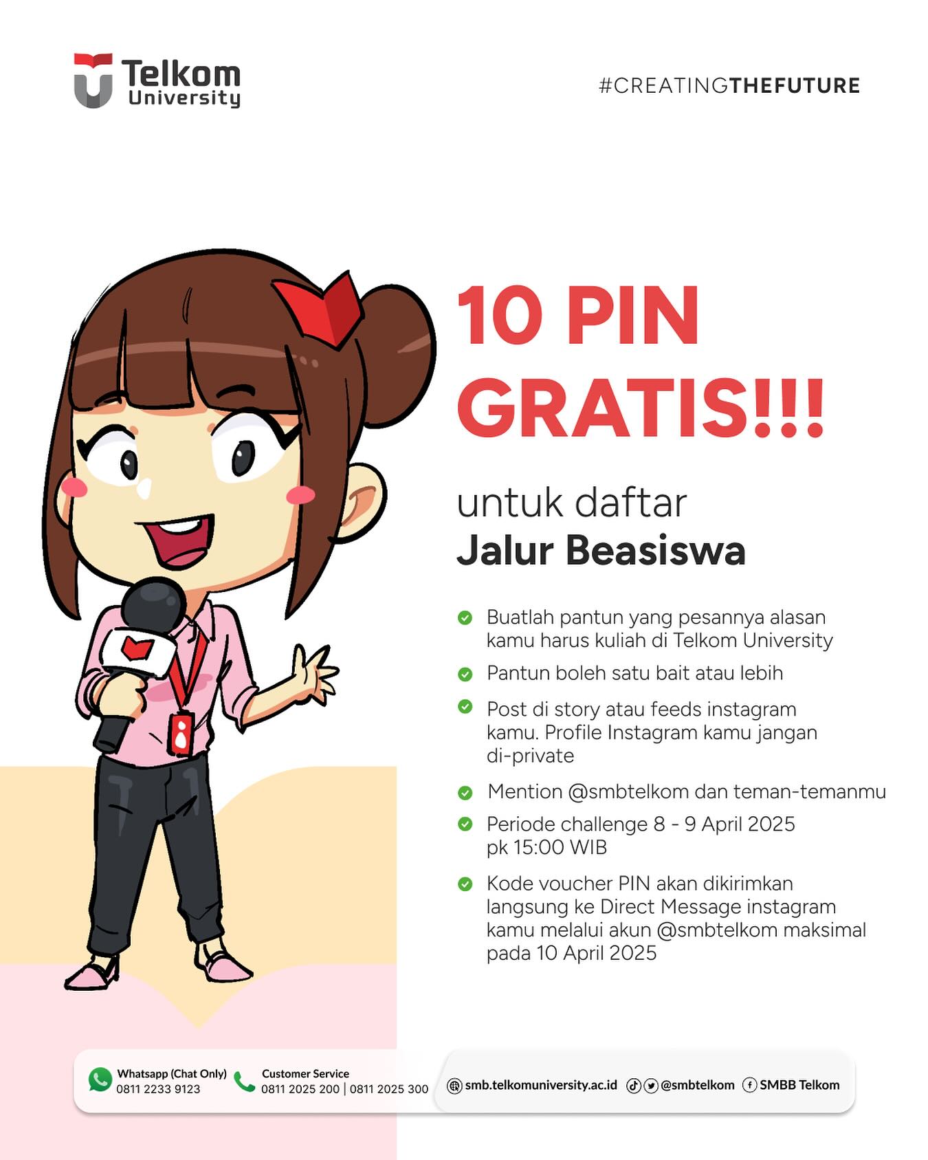Kode voucher PIN akan dikirimkan langsung ke Direct Message instagram kamu melalui akun @smbtelkom maksimal pada 10 April 2025