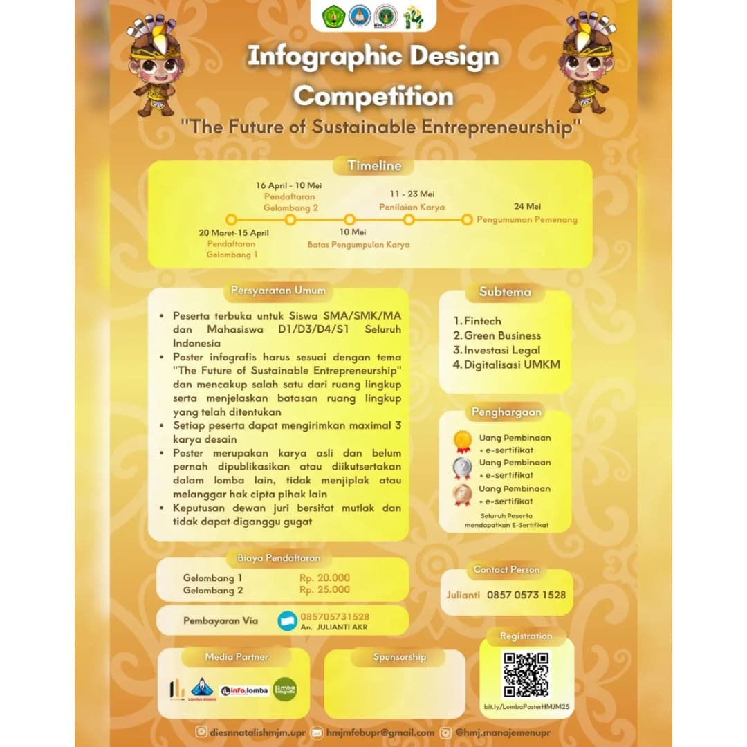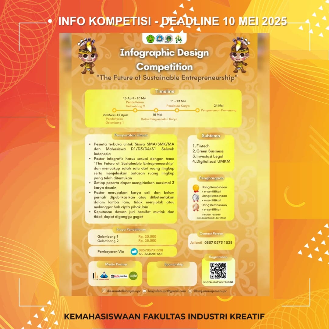 Waktunya tuangin ide-ide kerenmu dalam sebuah infografis yang memukau! Ikutan Infographic Design Competition dari HMJ Manajemen Universitas Palangka Raya! Tema kali ini “The Future of Sustainable Entrepreneurship” dan kamu bisa jadi bagian dari perubahan!