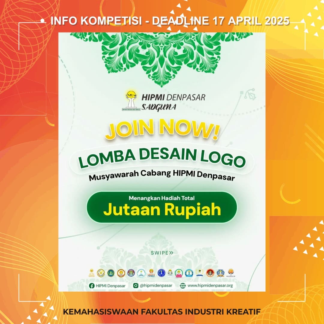 Dengan tema “Swadharmaning HIPMI Denpasar”, kamu diajak untuk menciptakan desain logo yang mencerminkan kesadaran dan tanggung jawab pengusaha muda dalam membangun ekosistem bisnis yang kuat, berdampak, dan berkelanjutan.