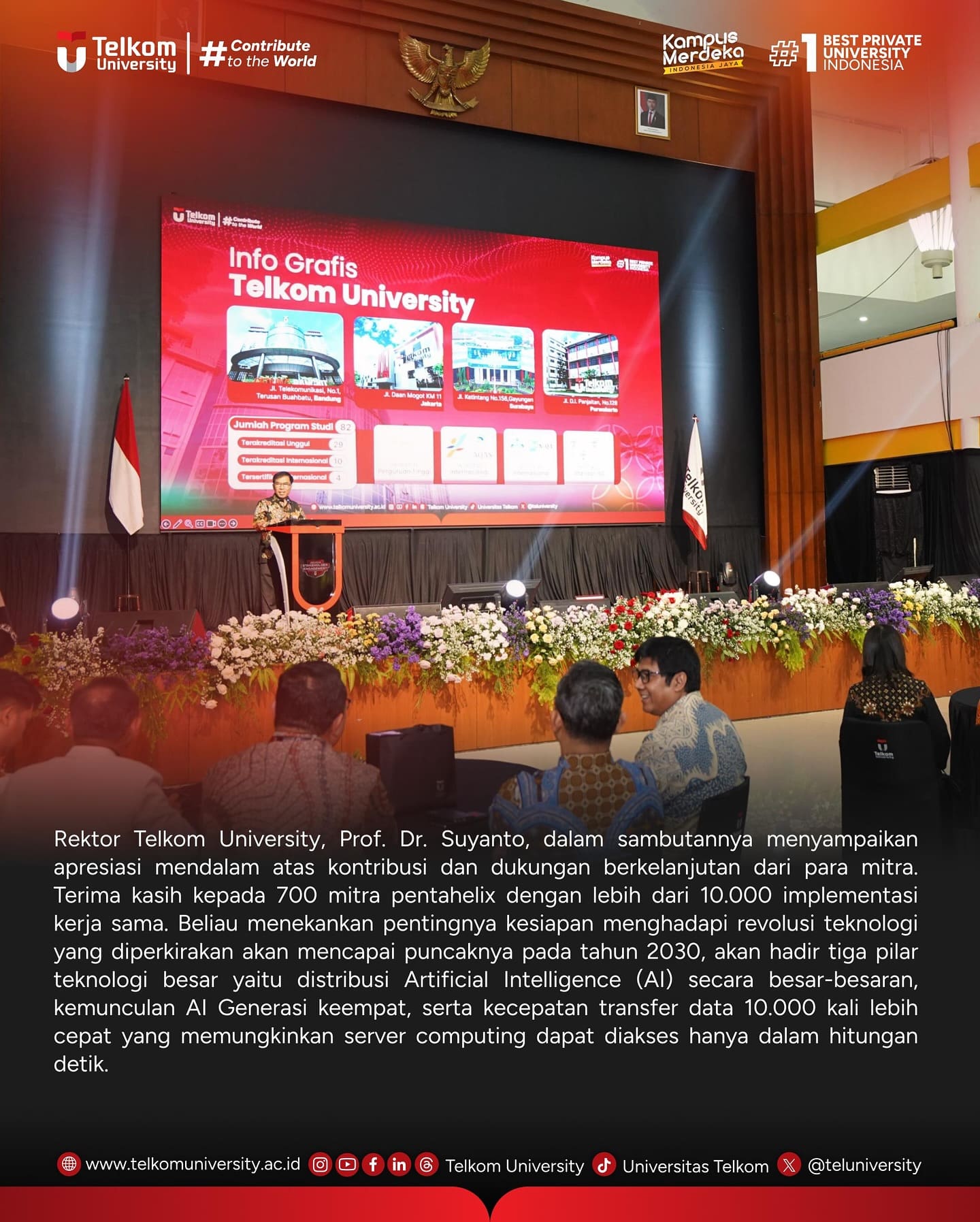 Rektor Telkom University, Prof. Dr. Suyanto, dalam sambutannya menyampaikan apresiasi mendalam atas kontribusi dan dukungan berkelanjutan dari para mitra. Terima kasih kepada 700 mitra pentahelix dengan lebih dari 10.000 implementasi kerja sama.