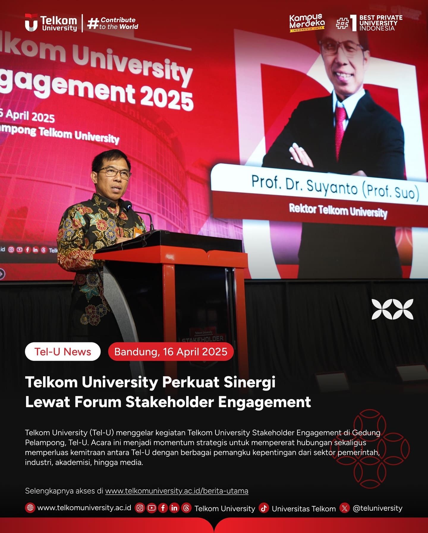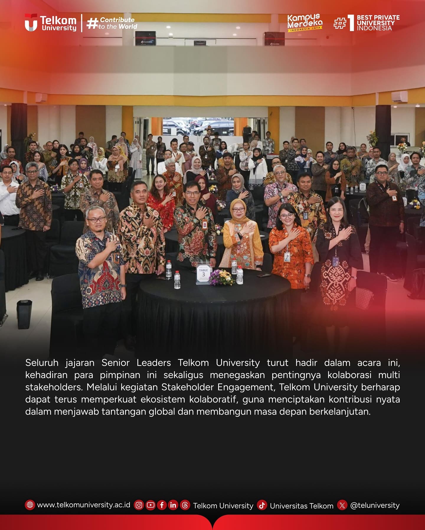 Telkom University menggelar Stakeholder Engagement di Gedung Pelampong. Acara ini menjadi momentum strategis untuk mempererat hubungan sekaligus memperluas kemitraan antara Tel-U dengan berbagai pemangku kepentingan dari sektor pemerintah, industri, hingga akademisi. Acara ini dihadiri oleh seluruh senior leaders, kehadiran para pimpinan ini sekaligus menegaskan pentingnya kolaborasi berkelanjutan yang menjadi landasan utama forum ini.