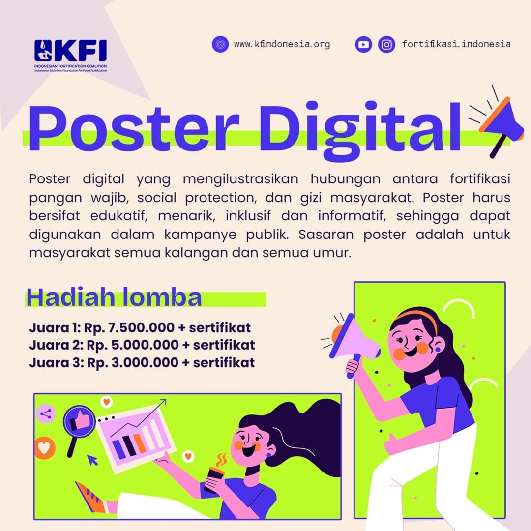 Ayo tuangkan kreativitasmu dalam bentuk poster digital yang edukatif, menarik, dan informatif dengan tema “Pentingnya Fortifikasi Pangan Wajib dalam Program Perlindungan Sosial”🎉