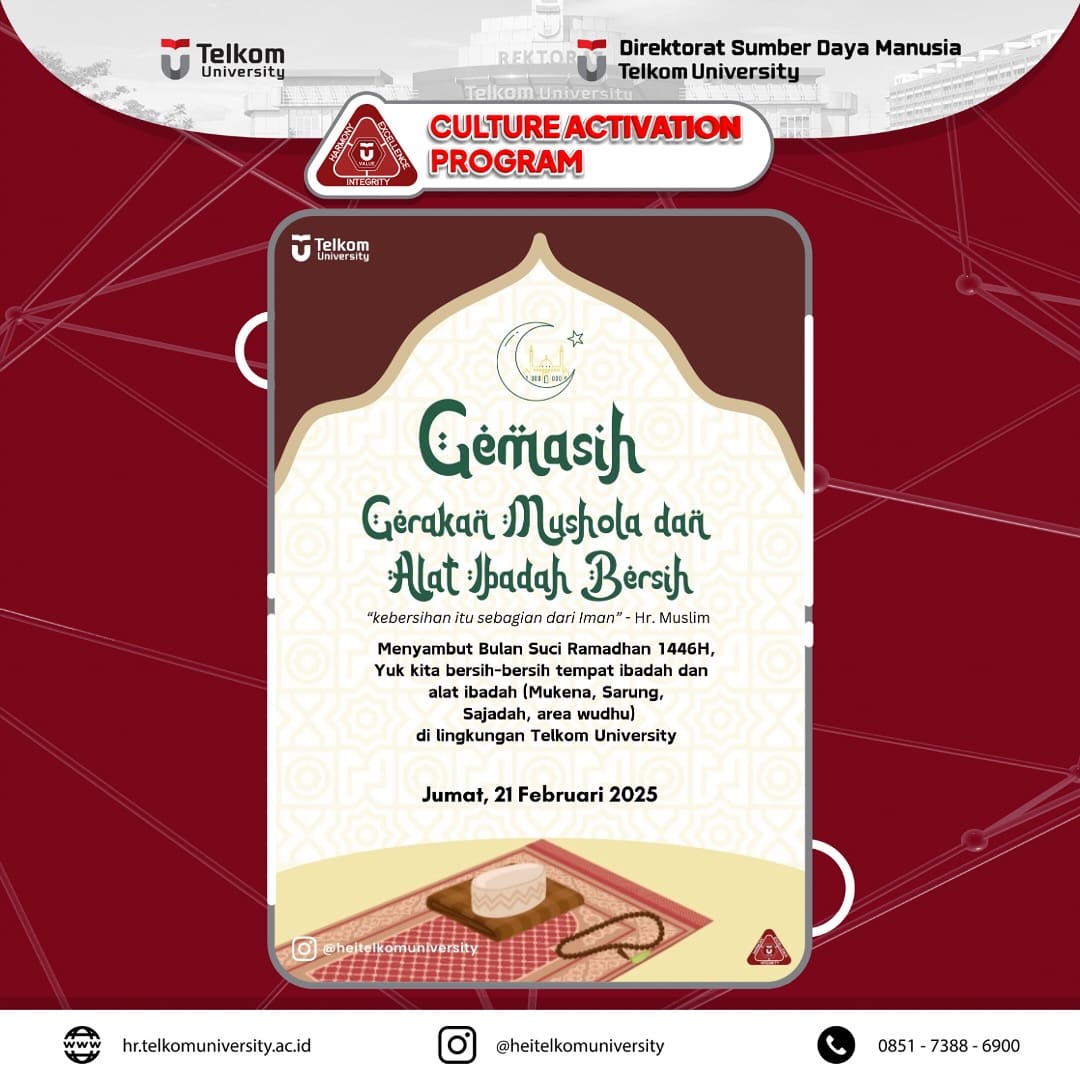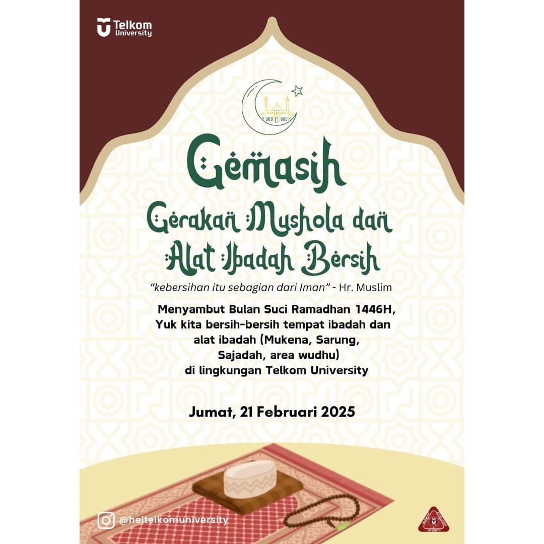 Kegiatan ini merupakan wujud kepedulian kita dalam menciptakan ruang ibadah yang bersih dan nyaman dengan membersihkan serta merawat alat ibadah. Kami mengajak seluruh civitas akademika, Fakultas/Direktorat, dan Culture Booster untuk berpartisipasi dan berkolaborasi dalam aksi kebaikan ini.