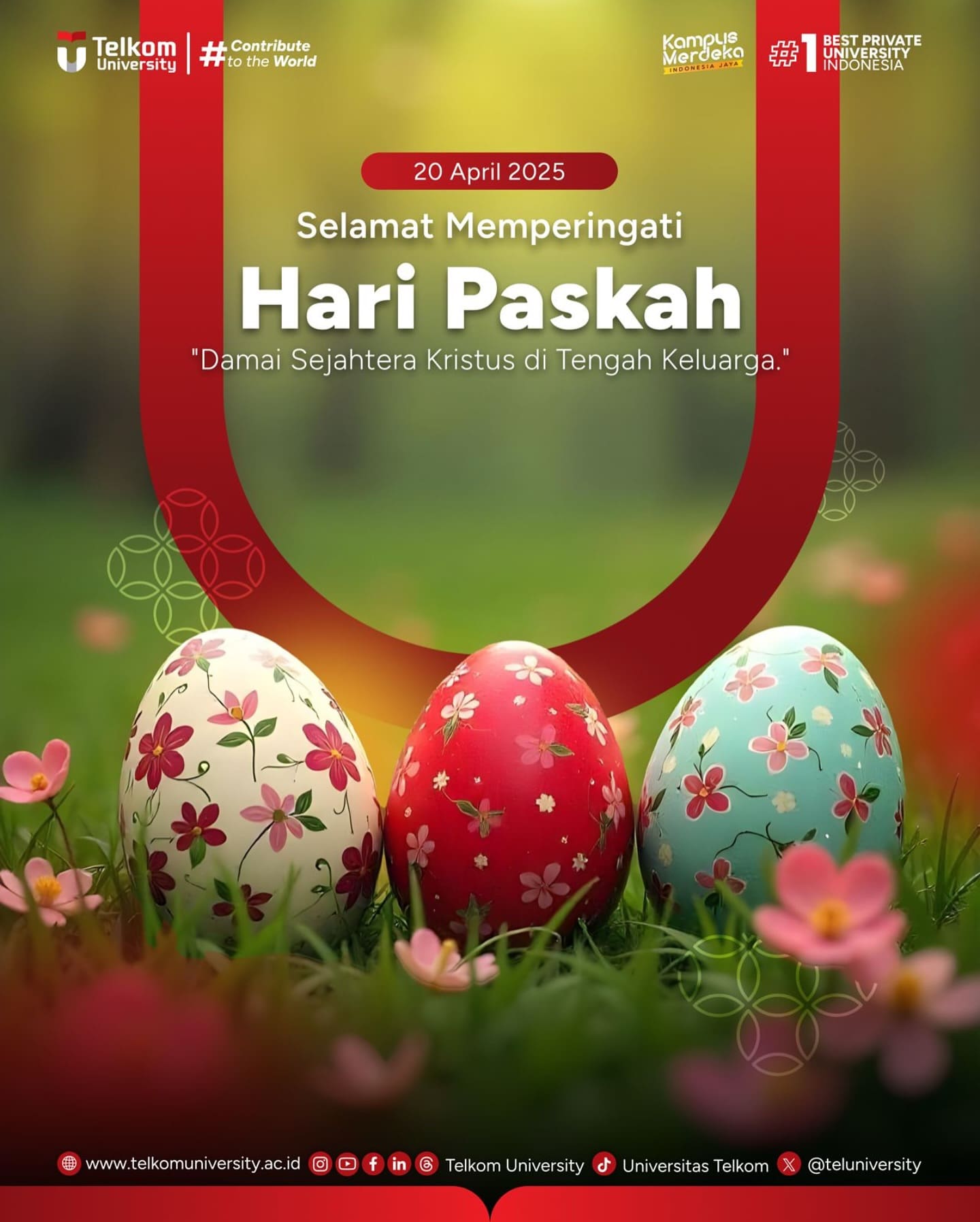 Selamat memperingati Hari Paskah bagi seluruh Civitas Academica. Semoga kebangkitan Sukacita Kristus membawakan ketenangan, harapan baru, dan semangat baru untuk terus berkarya. Semoga limpah kasih dan damai menyertai kita.