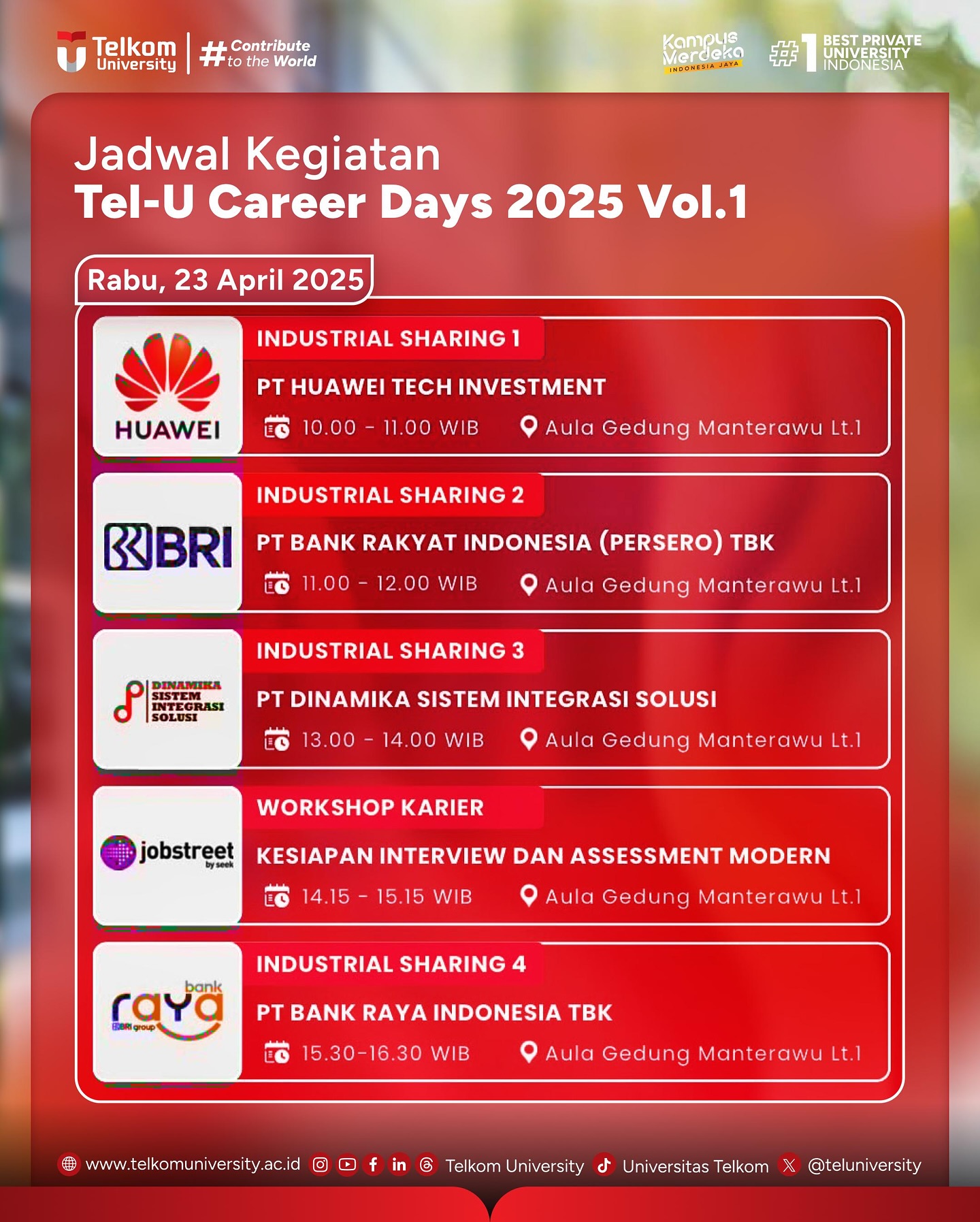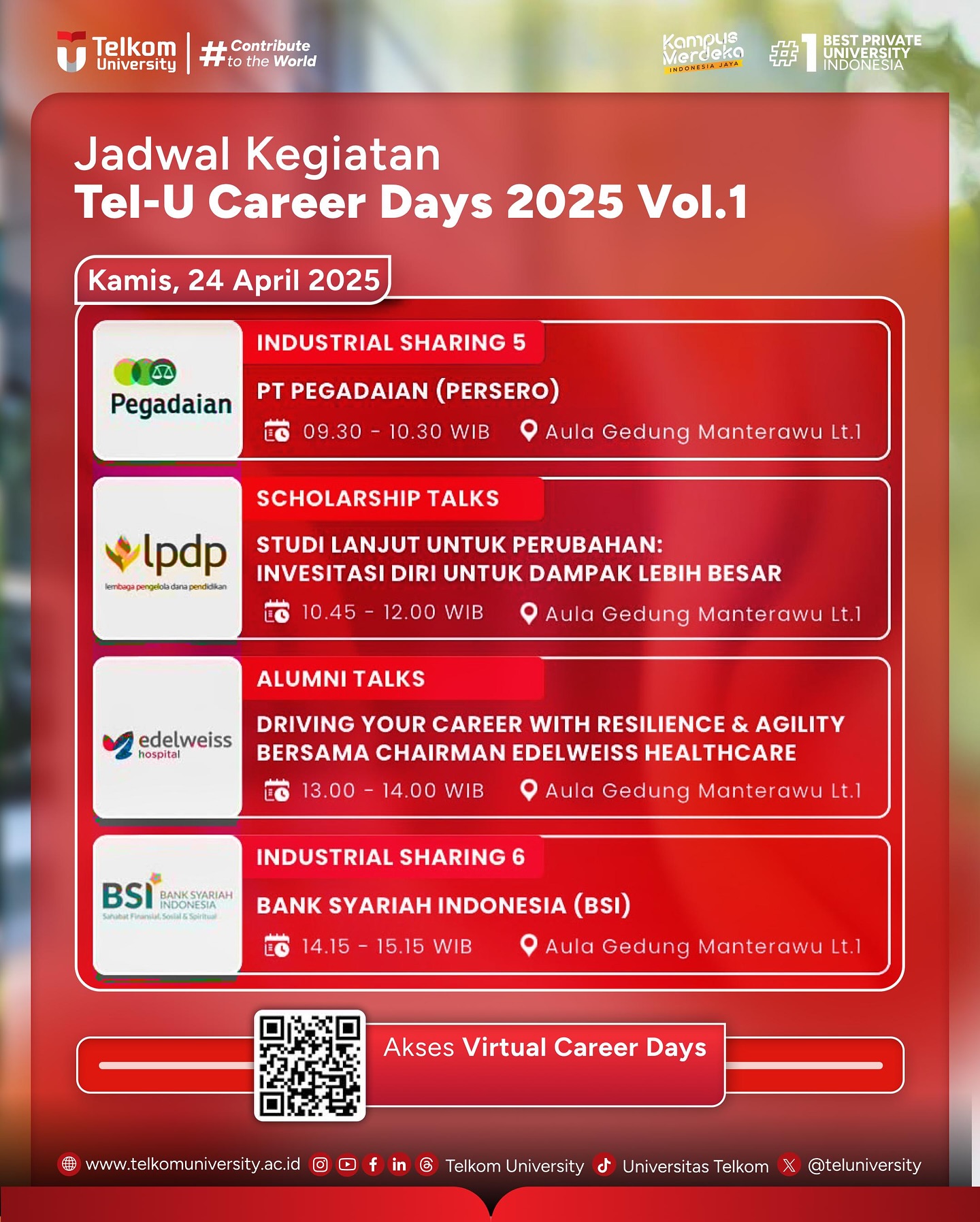 Tel-U Career Days merupakan pameran bursa kerja, yang rutin diselenggarakan oleh Bagian Pengembangan Karir dan Alumni, Direktorat Kemahasiswaan, Karir, dan Alumni, yang bertujuan memfasilitasi engagement antara mahasiswa dan alumni dengan mitra industri. Kegiatan Tahunan Telkom University Career Days kali ini akan berlangsung pada,