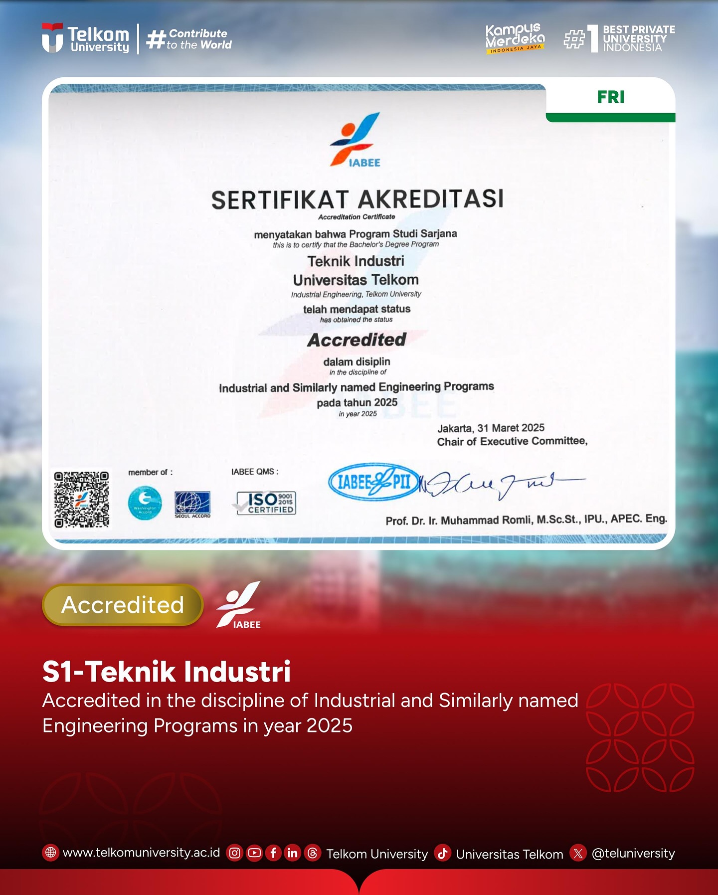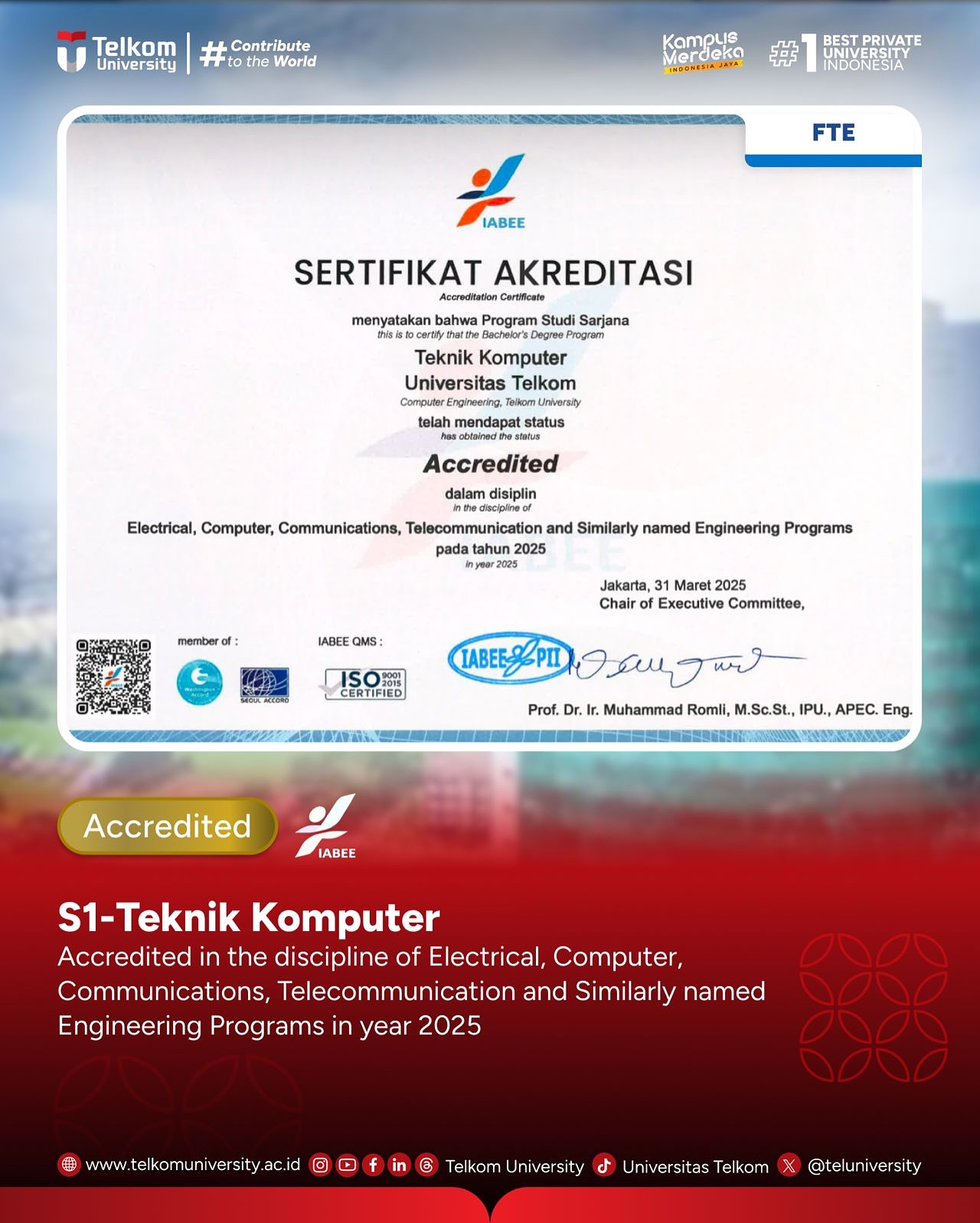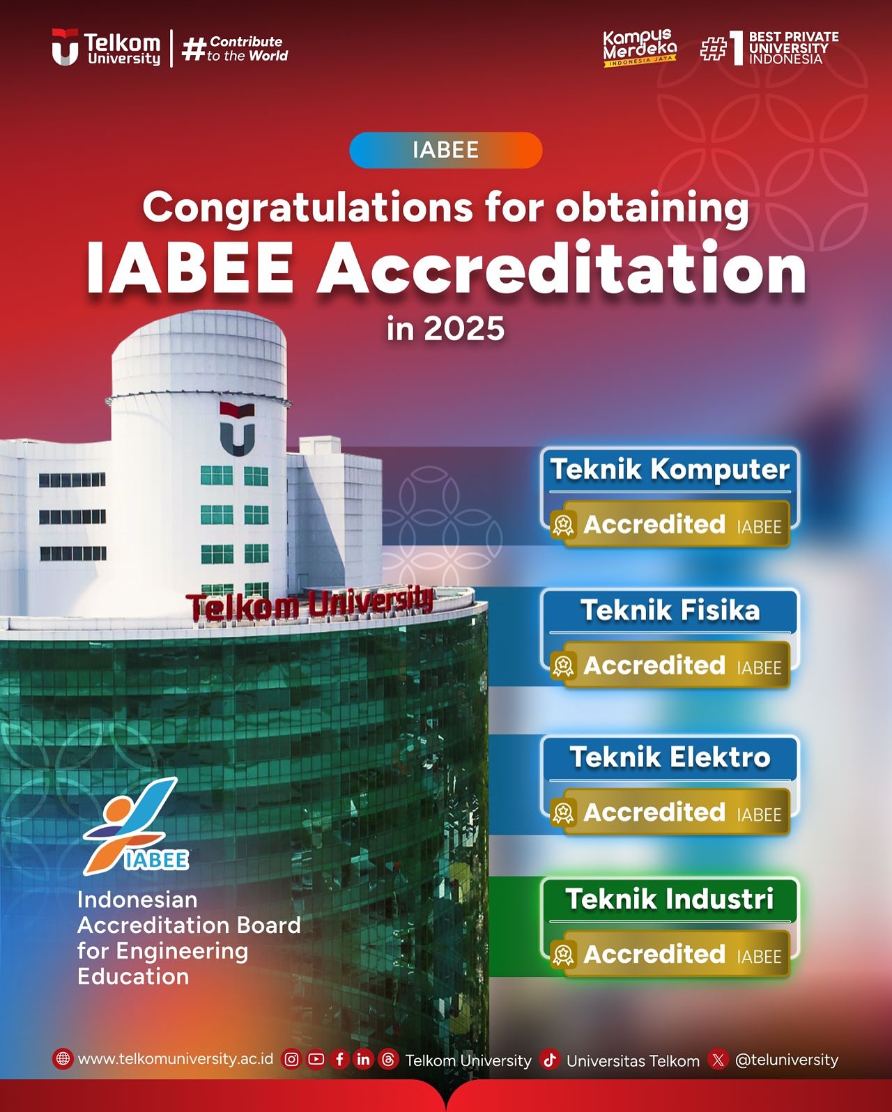 Telkom University dengan bangga mengucapkan selamat kepada program studi yang berhasil mendapatkan Akreditasi IABEE, diantaranya: