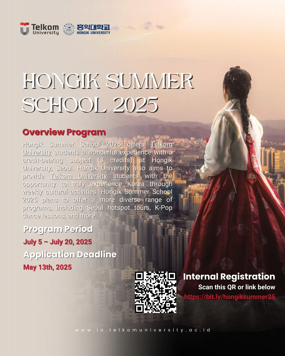 Get ready for an unforgettable summer in Seoul! HONGIK SUMMER SCHOOL 2025 is an immersive, credit-bearing program specially designed for Telkom University students. Held at the prestigious Hongik University, this two-week experience combines academic learning with rich cultural exploration in the heart of South Korea.
