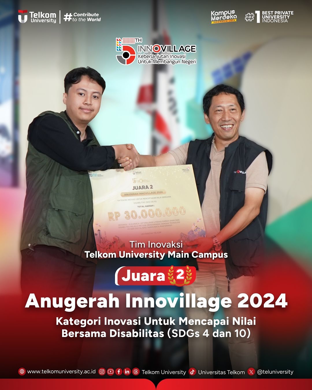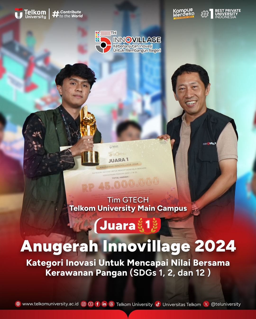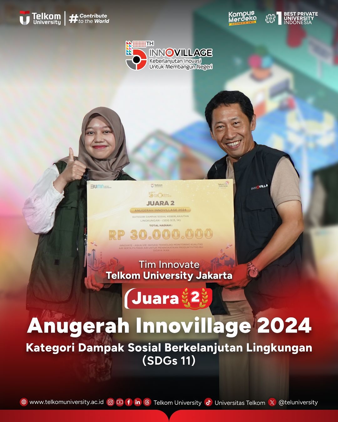Telkom University raih berbagai penghargaan di Anugerah Innovillage 2024, diantaranya: