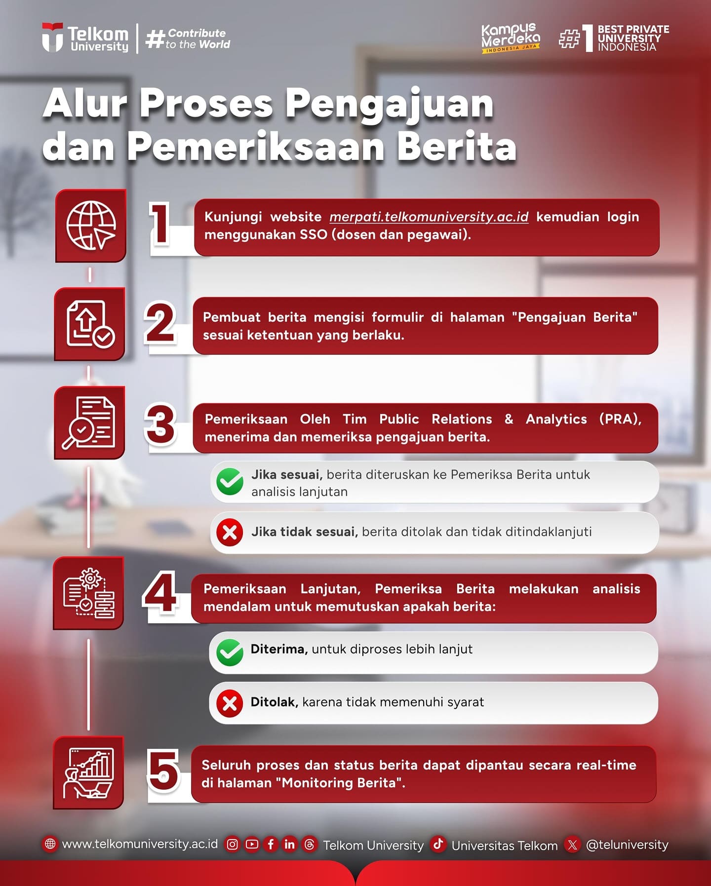 Telkom University meluncurkan aplikasi Merpati (Media Rilis Pemberitaan Terintegrasi). Aplikasi ini merupakan platform internal yang dikembangkan khusus untuk mendukung pengelolaan publikasi berita di lingkungan Telkom University. Aplikasi ini memfasilitasi proses pengajuan, persetujuan, hingga pemantauan publikasi berita melalui sistem yang terintegrasi. Pengguna dapat dengan mudah mengajukan berita, memantau status pengajuan secara real-time, serta melihat hasil publikasi melalui dashboard yang informatif. Tujuan utama aplikasi ini adalah meningkatkan efisiensi komunikasi media dan memastikan bahwa setiap informasi strategis tersampaikan secara tepat waktu, terdokumentasi dengan baik, dan dapat dipertanggungjawabkan. Aplikasi ini dikembangkan oleh Unit Public Relations & Analytics yang berada dibawah Direktorat Sekretariat dan Perencanaan Strategis, serta dikembangkan juga oleh Direktorat Pusat Teknologi dan Informasi.