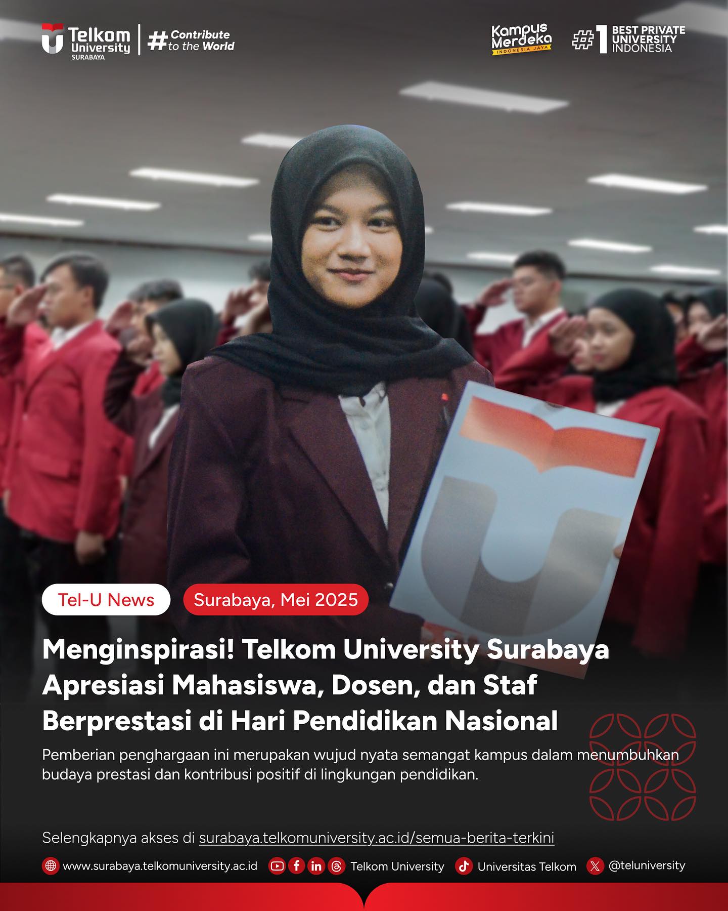 Sebagai wujud penghormatan, Telkom University Surabaya menyematkan penghargaan kepada mahasiswa, dosen, dan staf terbaiknya sebagai bentuk apresiasi atas dedikasi dan kontribusi positif mereka dalam menciptakan lingkungan akademik yang inspiratif dan berdaya saing❤️