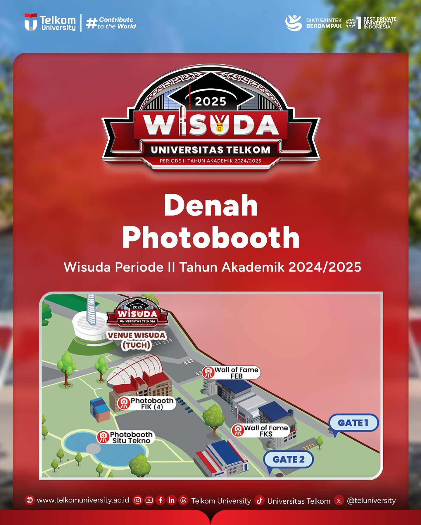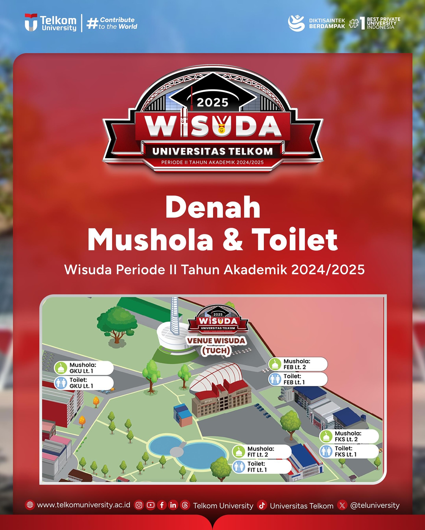 Ini dia denah Wisuda Telkom University. Kegiatan wisuda akan disiarkan secara langsung di kanal YouTube Telkom University. Jangan lupa untuk mengikuti kegiatan gladi wisuda, ditanggal 9 Mei 2025. Sampai jumpa di Telkom University Convention Hall TelUtizen!