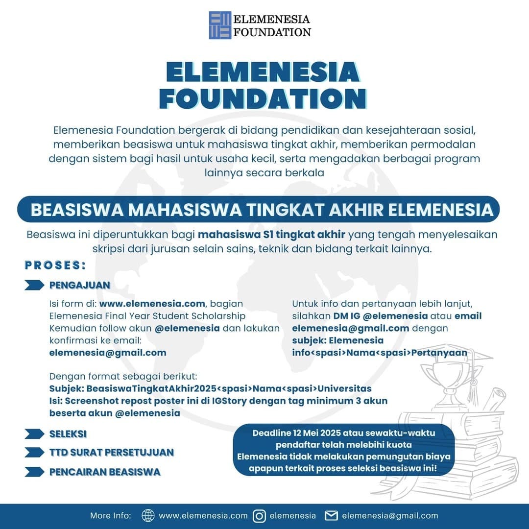 #scholarship #researchscholarship #indonesiascholarship #research #beasiswa #beasiswakuliah #beasiswaindonesia #beasiswapenelitian #penelitian #beasiswa2025 #elemenesiascholarship #skripsi #beasiswaskripsi #lulus #lulus2025 #luluskuliah #mahasiswa #mahasiswatingkatakhir #universitas #kampus #beasiswaindonesia2025