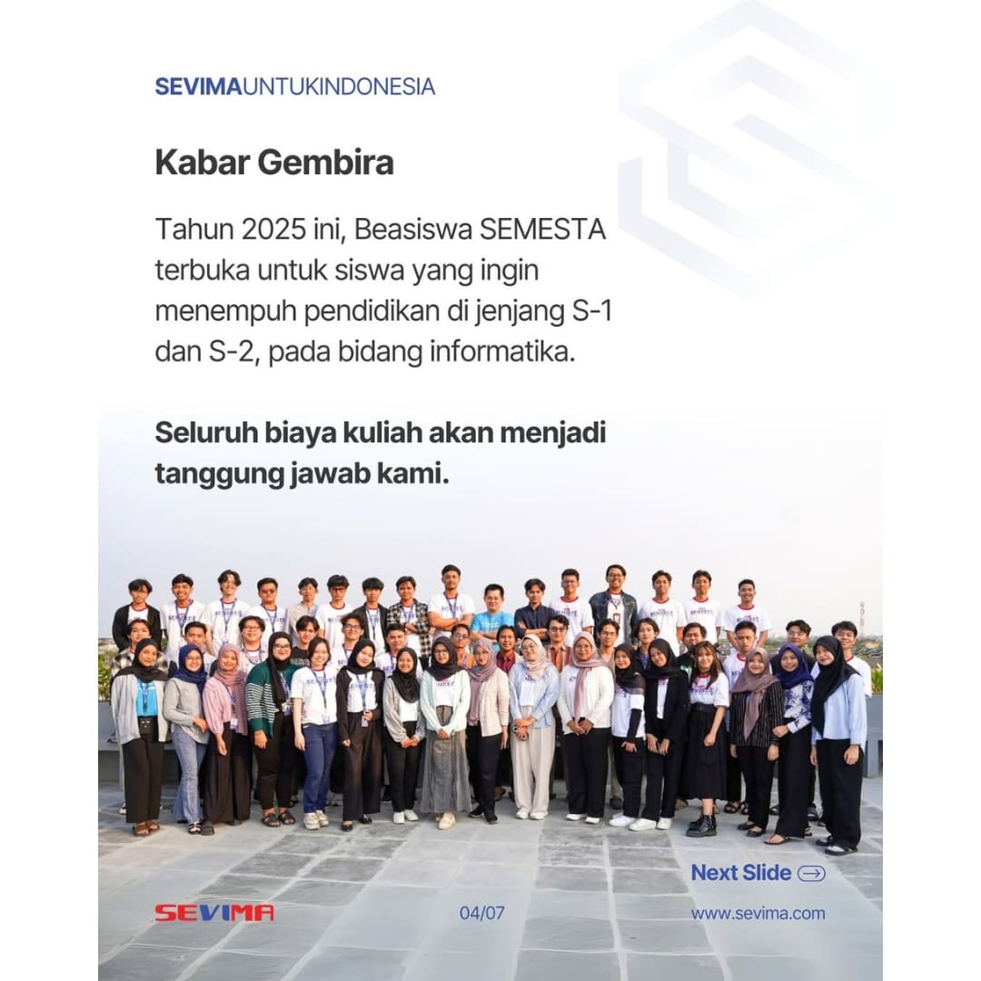 Sebagai bentuk nyata dari komitmen SEVIMA dalam meningkatkan kualitas pendidikan Indonesia, kami membuka program Beasiswa SEMESTA 2025. Beasiswa penuh untuk pendidikan S1 dan S2 ini diberikan kepada talenta terbaik yang siap membawa perubahan dalam dunia pendidikan.