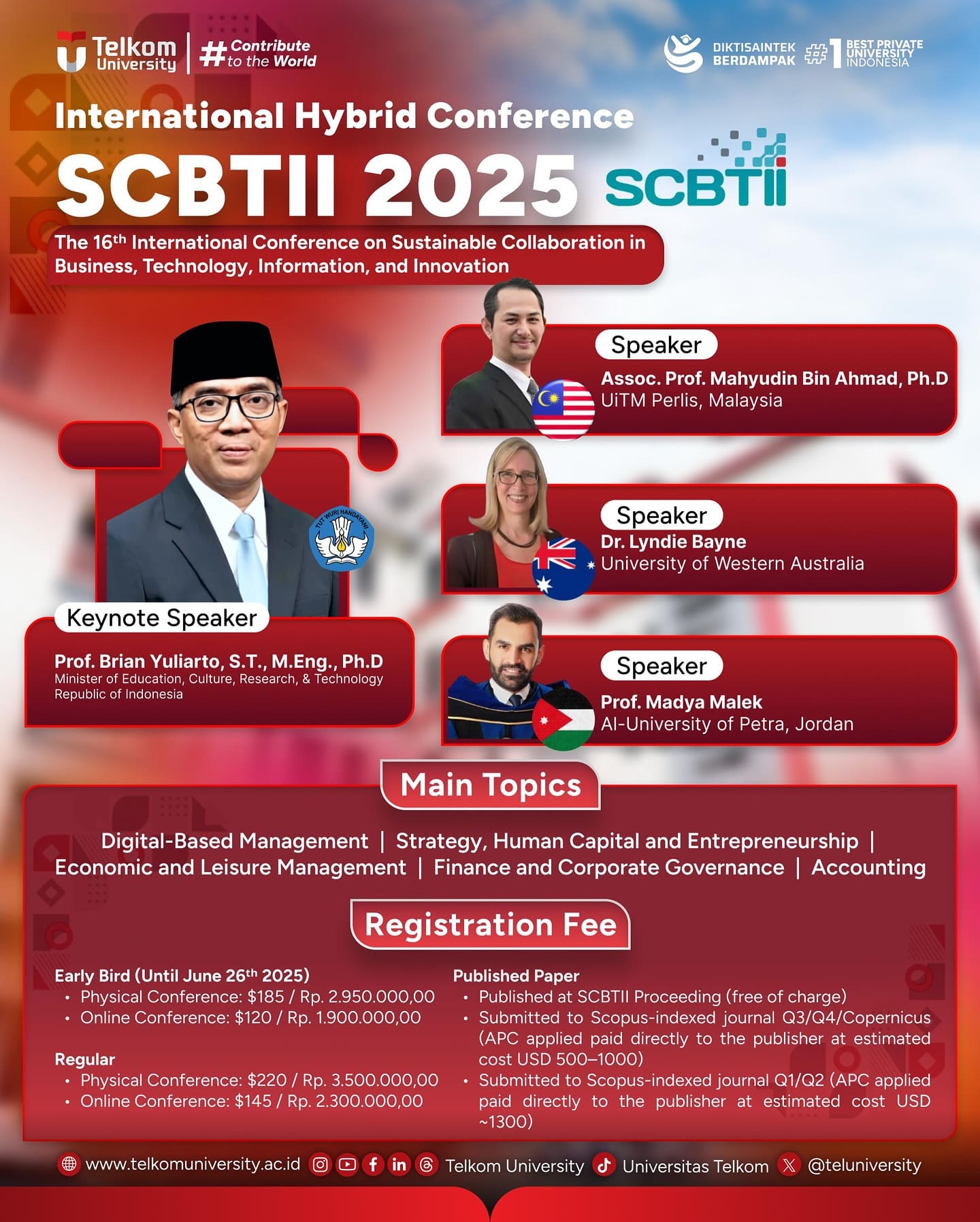 School of Economics and Business at Telkom University proudly invites scholars, students, researchers, practitioners, and lecturers to participate in the 16th International Conference on Sustainable Collaboration in Business, Information, and Innovation (SCBTII) 2025