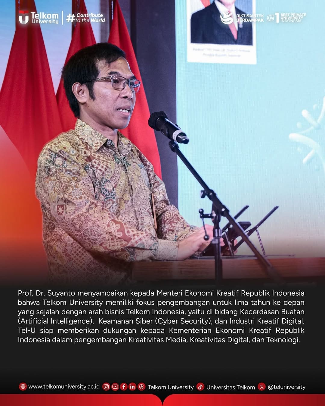 Tel-U dan Kemenekraf/Baparekraf Jalin Kerja sama dalam Pengembangan Ekonomi Kreatif di Universitas. Acara ini berlangsung di Ruang Rapat Buyan, Autograph Tower, Kompleks Thamrin Nine, Jakarta. Prof. Dr. Suyanto menyampaikan kepada Menteri Ekonomi Kreatif Republik Indonesia bahwa Telkom University memiliki fokus pengembangan untuk lima tahun ke depan yang sejalan dengan arah bisnis Telkom Indonesia, yaitu di bidang Kecerdasan Buatan (Artificial Intelligence), Keamanan Siber (Cyber Security), dan Industri Kreatif Digital. Secara lebih spesifik, Tel-U siap memberikan dukungan kepada Kementerian Ekonomi Kreatif Republik Indonesia dalam pengembangan Kreativitas Media, Kreativitas Digital, dan Teknologi. Harapannya, Tel-U dapat menyinergikan program Tri Dharma Perguruan Tinggi yakni Pendidikan dan Pengajaran, Penelitian dan Pengabdian kepada Masyarakat dengan pengembangan ekonomi kreatif. Selain itu melalui kerja sama ini dapat memperkuat sinergi antara kebijakan pemerintah dan kontribusi akademisi untuk menciptakan ekosistem ekonomi kreatif yang inklusif, inovatif, dan berkelanjutan.