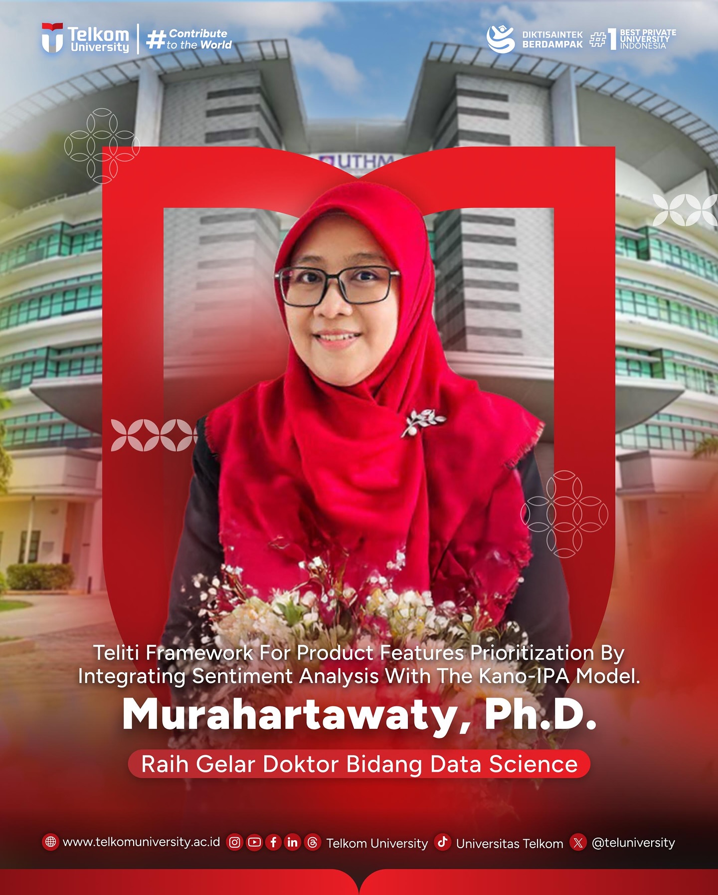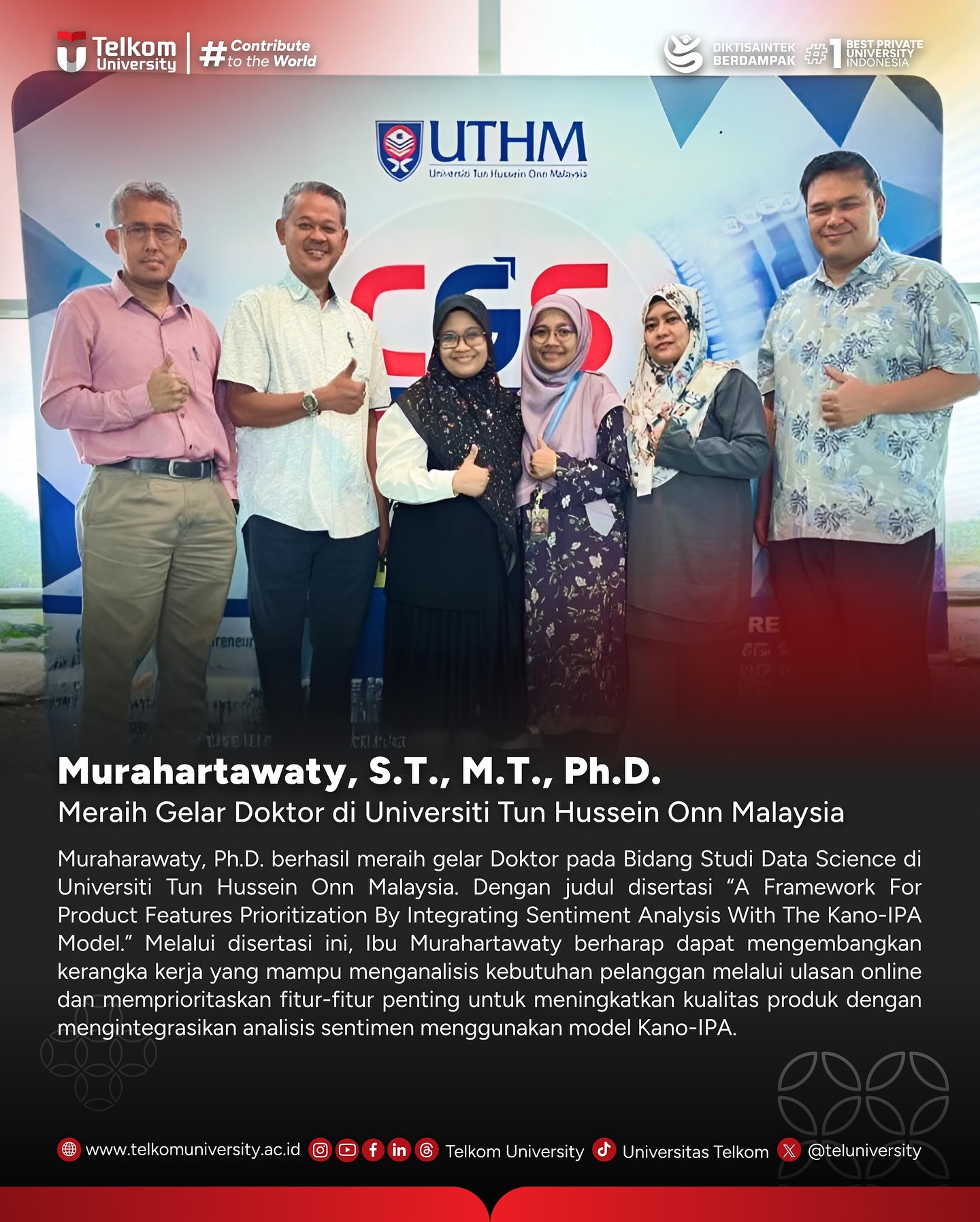 Murahartawaty, S.T., M.T., Ph.D. meraih Gelar Doktor di Universiti Tun Hussein Onn Malaysia pada Bidang Studi Data Science. Dengan judul disertasi “A Framework For Product Features Prioritization By Integrating Sentiment Analysis With The Kano-IPA Model.” Melalui disertasi ini, Ibu Murahartawaty berharap dapat mengembangkan kerangka kerja yang mampu menganalisis kebutuhan pelanggan melalui ulasan online dan memprioritaskan fitur-fitur penting untuk meningkatkan kualitas produk dengan mengintegrasikan analisis sentimen menggunakan model Kano-IPA.