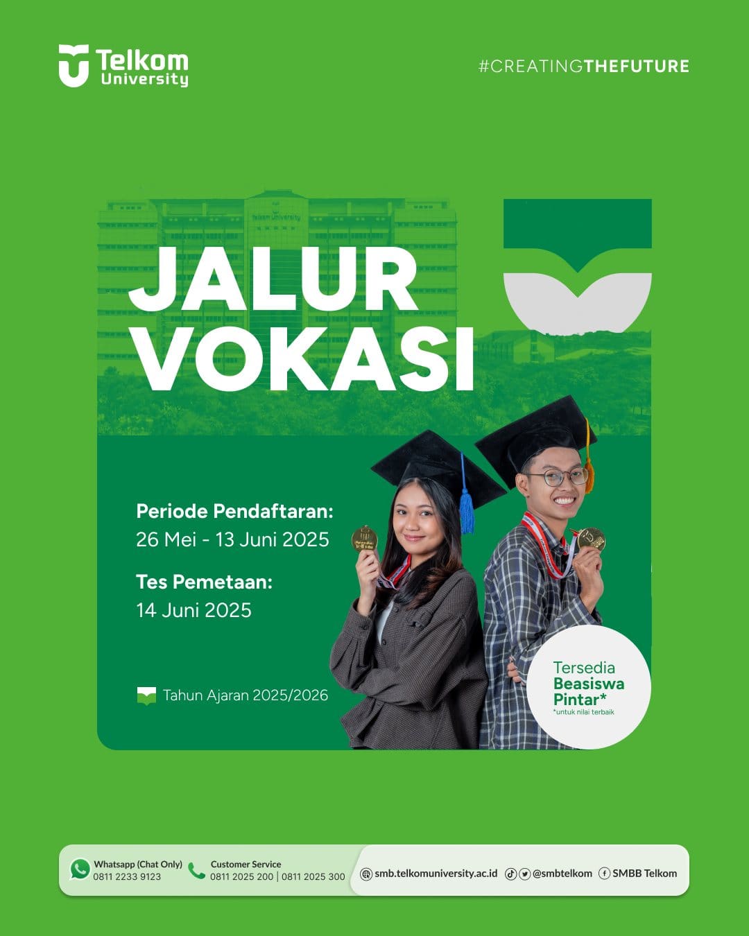 Telah dibuka pendaftaran Jalur Vokasi periode 26 Mei – 13 Juni 2025 🙌