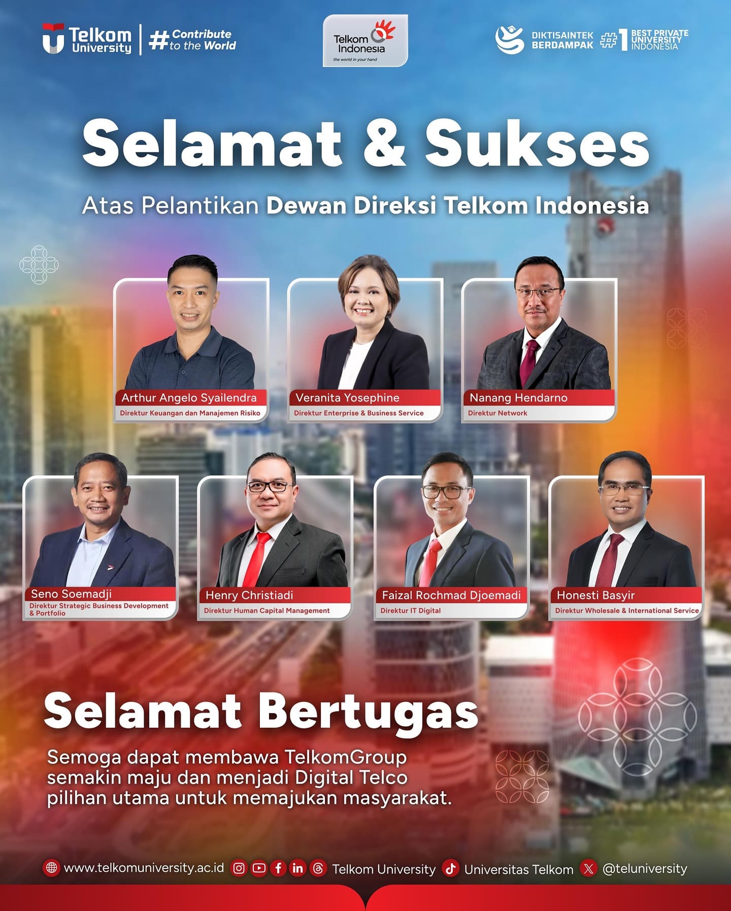 Rektor beserta seluruh Civitas Academica Telkom University mengucapkan selamat kepada jajaran Dewan Direksi PT Telkom Indonesia (Persero) Tbk. yang telah resmi dilantik.
