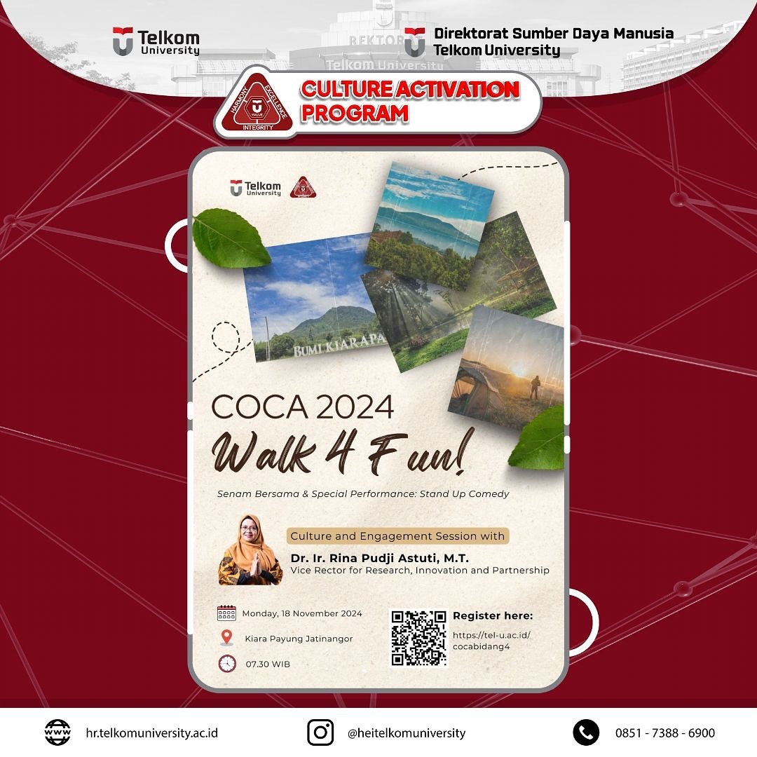 Calendar of Culture Action (CoCA) kembali hadir bersama dengan Bidang Riset, Inovasi dan Kerjasama melalui agenda Culture and Engagement Session – Walk 4 Fun bersama dengan Dr. Ir. Rina Pudji Astuti selaku Culture Champion, yang akan dilaksanakan pada:
