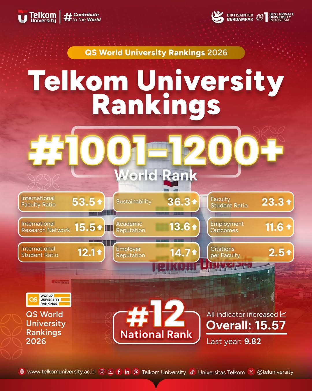 Telkom University kembali mencatatkan prestasi pada QS World University Rankings (WUR) 2026 yang menempati peringkat global 1001–1200. Capaian ini disertai peningkatan signifikan pada skor keseluruhan (overall score) dari tahun sebelumnya, yakni dari 9,82 (2025) menjadi 15,57 (2026).