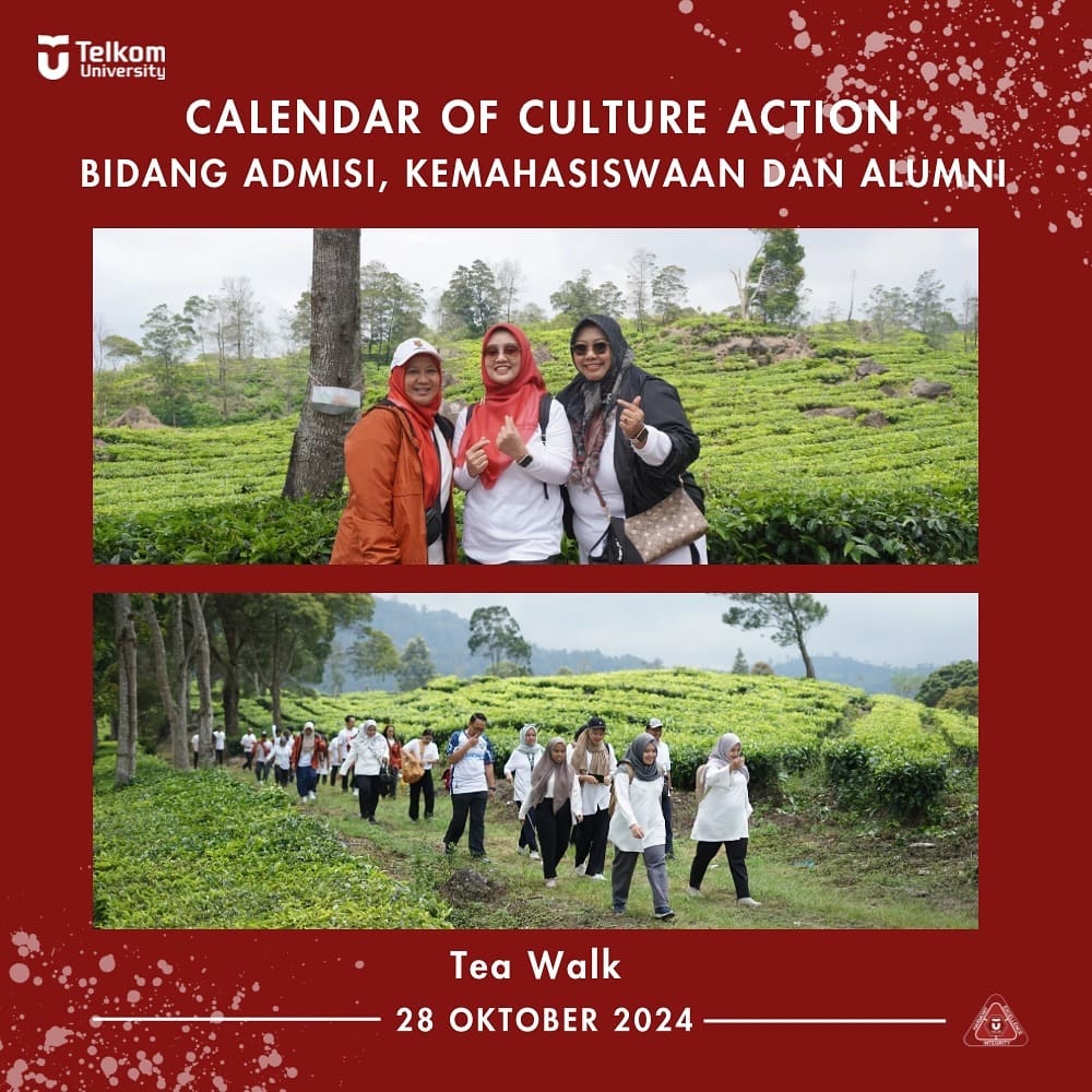 (28/10) Telah dilaksanakan agenda CoCA yakni kegiatan Culture and Engagement Session bersama Culture Champion dengan tema “Ti-Walk” (Bidang Tiga Jalan-jalan) yang dihadiri oleh Dr. Dida Diah Damajanti, S.T., M.Eng., Sc. selaku Culture Champion untuk memberikan arahan mengenai Tujuan Telkom University serta memperkuat Budaya Harmony, Excellence, Integrity yang dilaksanakan senin, 28 Oktober di Kebun Teh Rancabali, Ciwidey yang dimulai pukul 08.00-13.00 WIB.