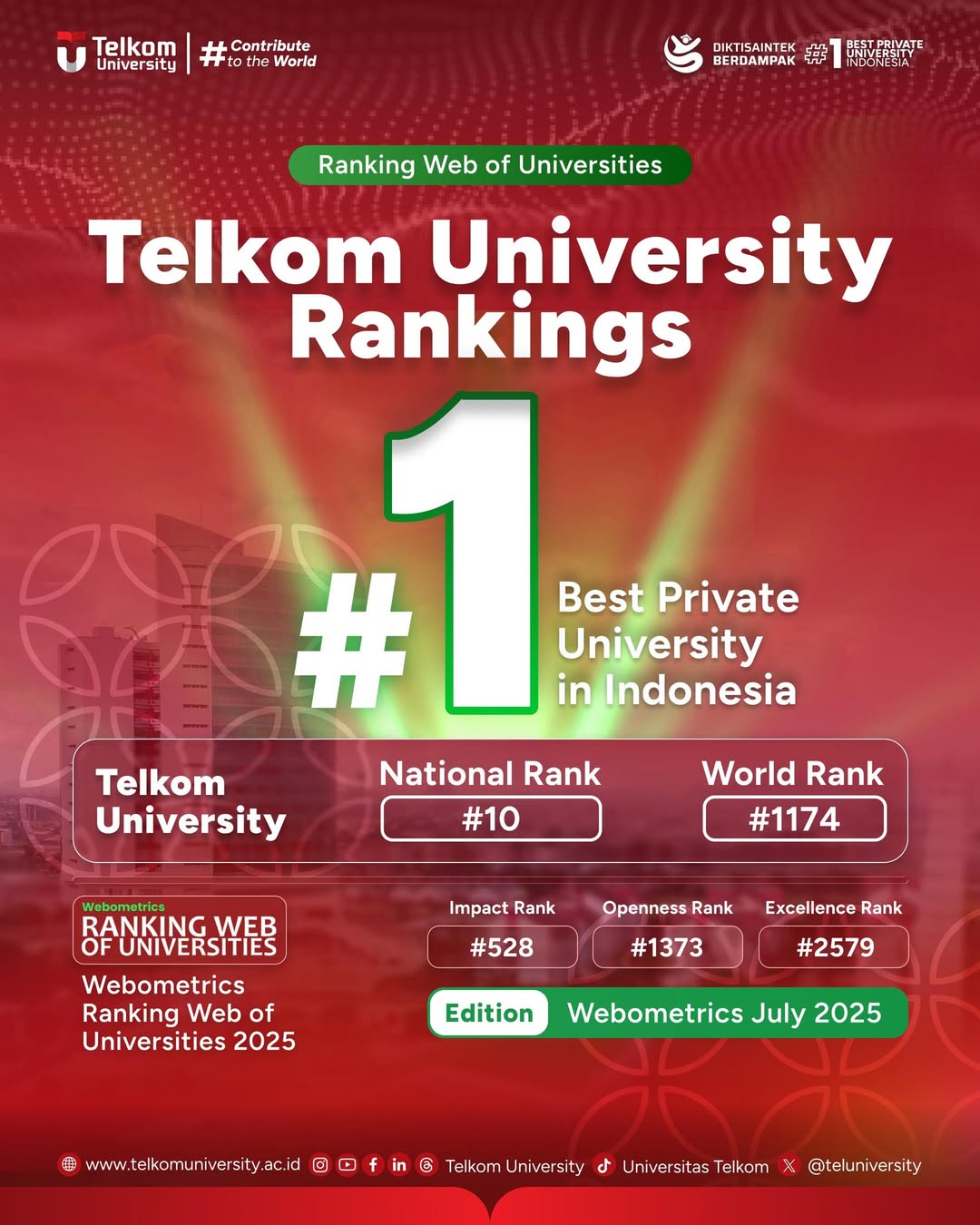 Telkom University kembali meraih prestasi membanggakan pada pemeringkatan Webometrics Ranking of World Universities edisi Juli 2025, Telkom University berhasil meraih peringkat 10 Nasional dan menjadi Perguruan Tinggi Swasta (PTS) #1 di Indonesia.