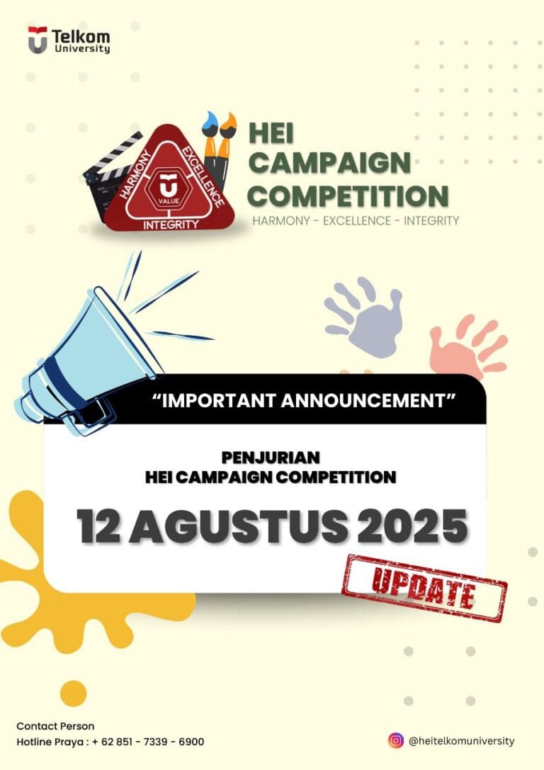 Tim juri akan berkunjung secara onsite untuk menilai karya-karya dari para peserta di Telkom University Bandung, serta melakukan penilaian secara daring untuk Kampus Cabang Telkom University. Pastikan seluruh campaign, dekorasi, dokumentasi, dan elemen kampanye HEI-mu telah disiapkan secara maksimal.