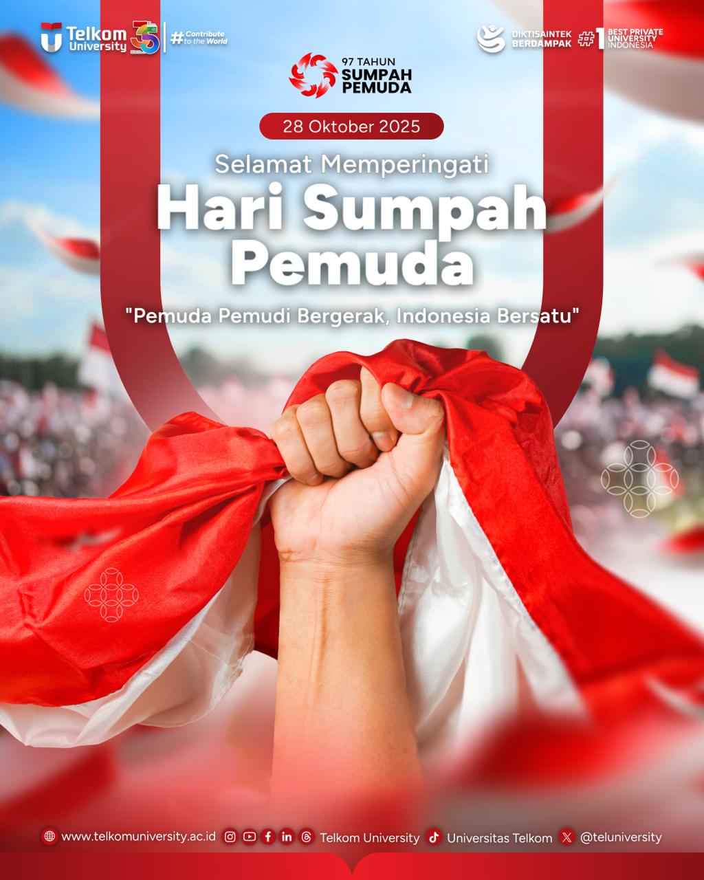 Selamat memperingati Hari Sumpah Pemuda. Ditanggal 28 Oktober ini para pemuda terdahulu berjuang untuk menyatukan semangat kemerdekaan bagi Bangsa Indonesia. Mari kita bersama-sama meneruskan semangat perjuangan untuk mempertahankan kemerdekaan Indonesia, dan meningkatkan semangat untuk kemajuan Indonesia. Pemuda pemudi bergerak, Indonesia bersatu.